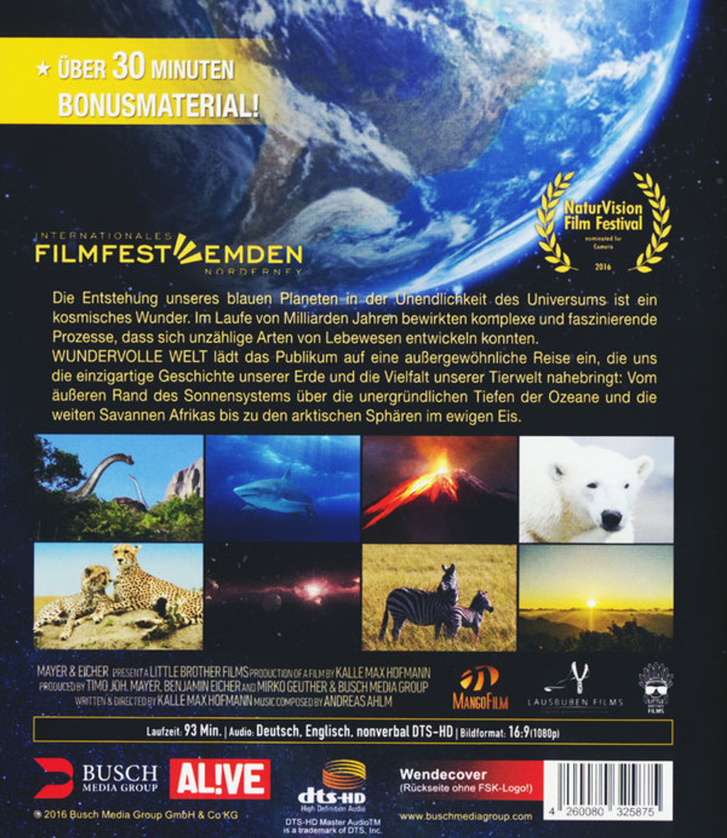 Die Entstehung unseres blauen Planeten in der Unendlichkeit des Universums ist ein kosmisches Wunder. Im Laufe von Milliarden Jahren bewirkten komplexe und faszinierende Prozesse, dass sich unzählige Arten von Lebewesen entwickeln konnten. "Wundervolle Welt" lädt das Publikum auf eine außergewöhnliche Reise ein, die uns die einzigartige Geschichte unserer Erde nahebringt: Vom äußeren Rand des Sonnensystems über die unergründlichen Tiefen der Ozeane und die weiten Savannen Afrikas bis zu den arktischen Sphären im ewigen Eis. In beeindruckenden Bildern erleben wir die Schönheit und die Vielfalt unserer Pflanzen- und Tierwelt. Verständlich aufbereitet und meisterhaft erzählt, bietet "Wundervolle Welt" ein visuell faszinierendes und lehrreiches Erlebnis für die ganze Familie, das auf Anhieb begeistert und immer wieder Freude bereiten wird.
