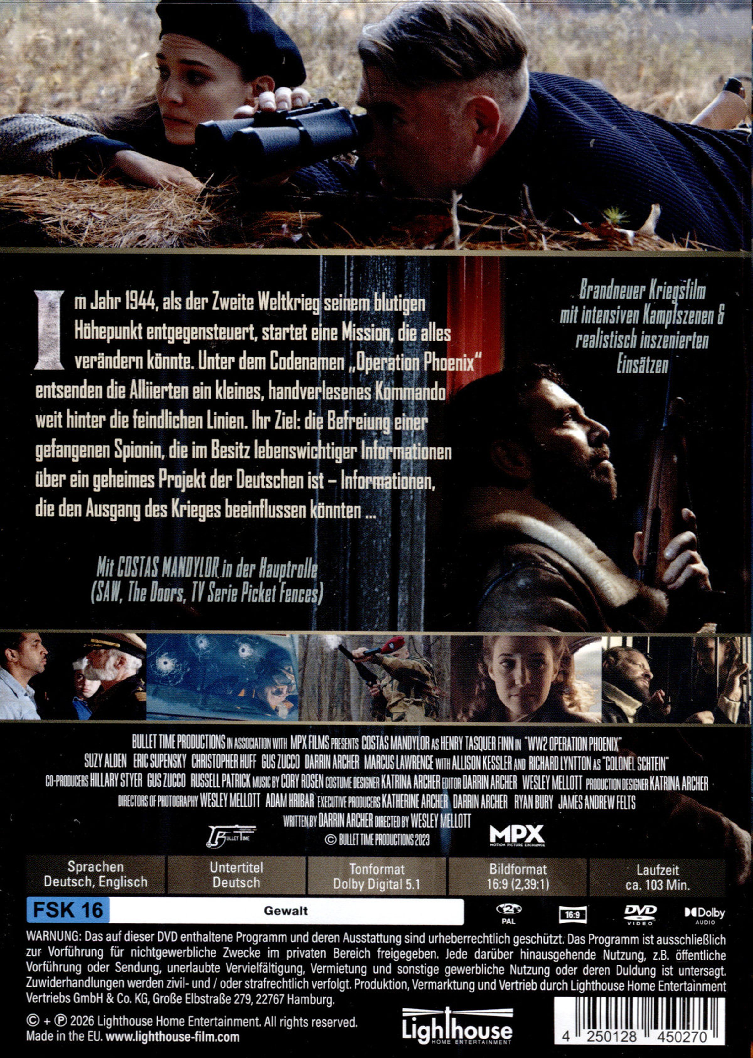 "WWII Operation Phoenix" in großer Schrift. Soldat steht vor rauchiger Kriegslandschaft, über ihm fliegt ein brennendes Flugzeug., DVD