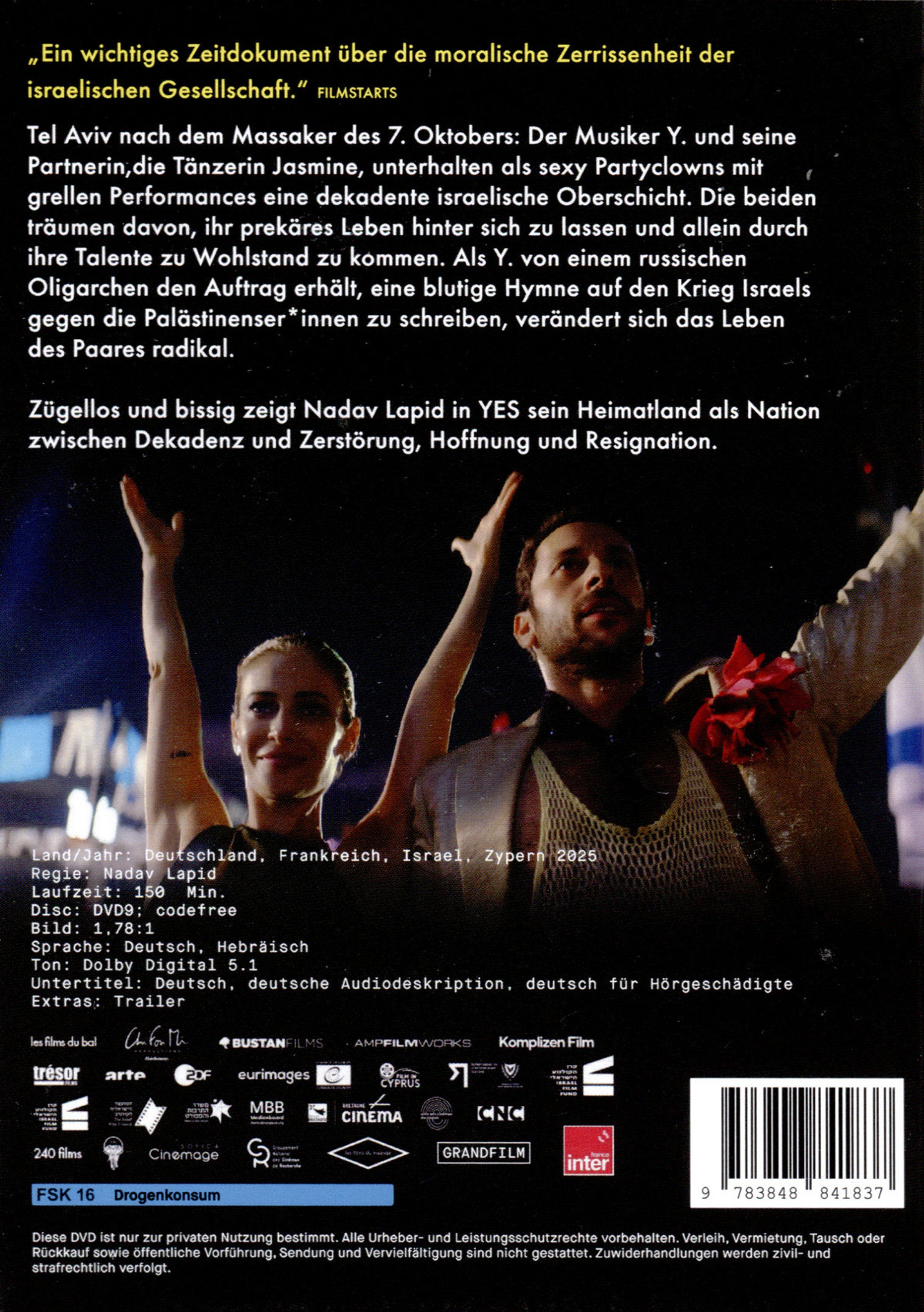 Tel Aviv nach dem Massaker des 7. Oktobers: Der Musiker Y. und seine Partnerin, die Tänzerin Jasmine, unterhalten als sexy Partyclowns mit grellen Performances die dekadente israelische Oberschicht. Die beiden träumen davon, ihr prekäres Leben hinter sich zu lassen und allein durch ihre Talente zu Wohlstand zu kommen. Als Y. von einem russischen Oligarchen den Auftrag erhält, eine blutige Hymne auf den Krieg Israels gegen die Palästinenser*innen zu schreiben, verändert sich das Leben des Paares radikal: Während über die Bildschirme Nachrichten vom Grauen in Gaza flimmern und sich die Straßen Tel Avivs mit nationalistischer Propaganda füllen, werden Y. und Jasmine mit den Grundlagen ihres moralischen Koordinatensystems konfrontiert. Nadav Lapid ist, seitdem sein Film SYNONYMES den Goldenen Bären der Berlinale gewonnen hat, der weltweit sichtbarste israelische Filmemacher. Zügellos und bissig zeigt er in YES sein Heimatland als Nation zwischen Dekadenz und Zerstörung, Hoffnung und Resignation. Zu Recht gilt Lapids mit Brutalität und Zärtlichkeit erzählte Satire auf eine von Krieg und Terror zerrissene Gesellschaft als Israels umstrittenster Film des Jahres.