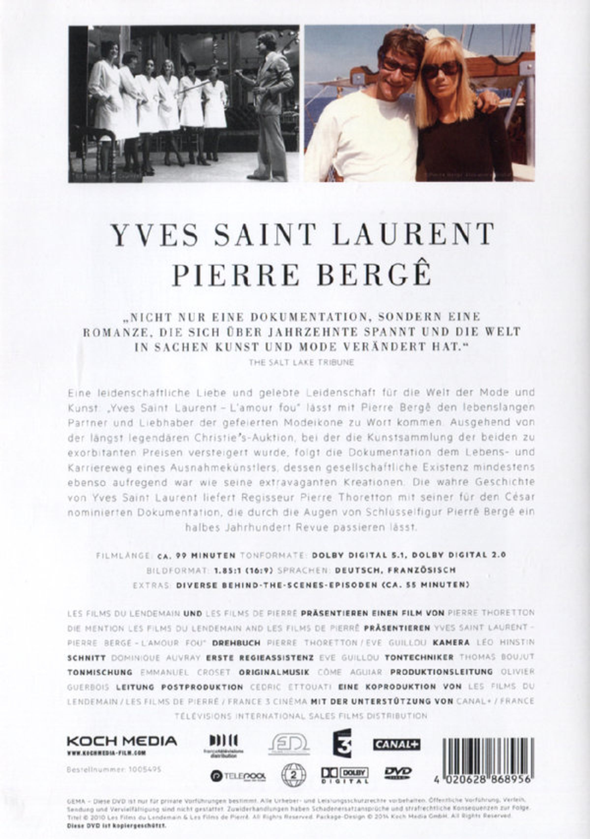 Eine leidenschaftliche Liebe und gelebte Leidenschaft für die Welt von Mode und Kunst: "Yves Saint-Laurent - L’amour fou" lässt mit Pierre Bergé den lebenslangen Partner und Liebhaber der gefeierten Mode-Ikone zu Wort kommen. Ausgehend von der längst legendären Christies-Auktion, bei der beider Kunstsammlung zu exorbitanten Preisen versteigert wurde, folgt die Dokumentation dem Lebens- und Karriereweg eines Ausnahmekünstlers, dessen gesellschaftliche Existenz mindestens ebenso aufregend war wie seine extravagante Kreationen