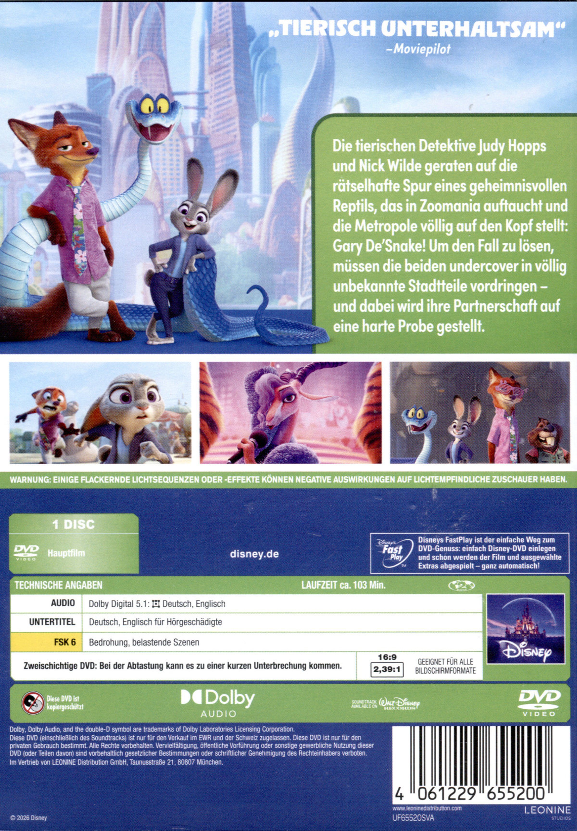 Die tierischen Detektive Judy Hopps und Nick Wilde geraten auf die rätselhafte Spur eines geheimnisvollen Reptils, das in Zoomania auftaucht und die Metropole völlig auf den Kopf stellt: Gary De’Snake! Um den Fall zu lösen, müssen die beiden undercover in völlig unbekannte Stadtteile vordringen - und dabei wird ihre Partnerschaft auf eine harte Probe gestellt.