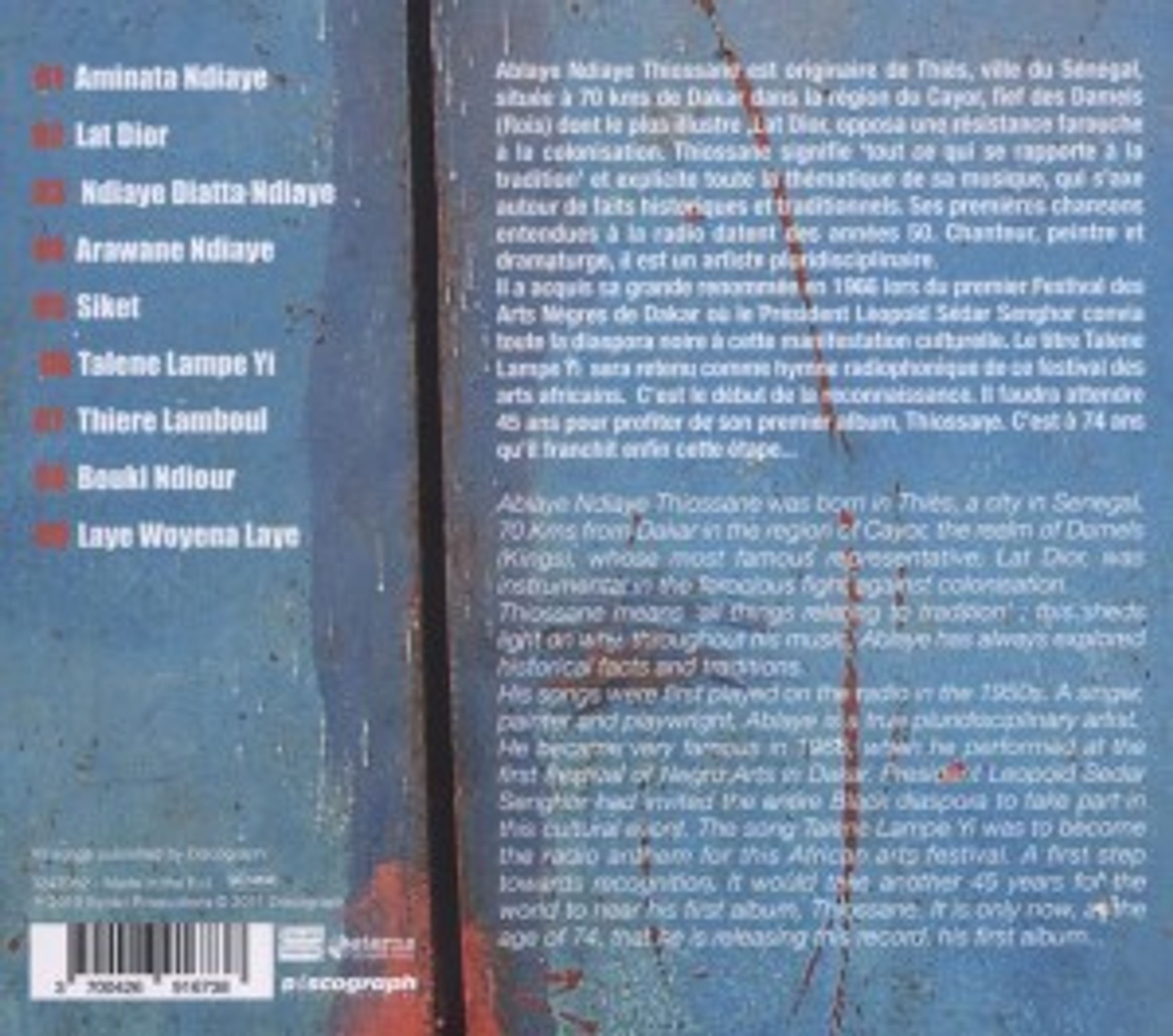All diese prägenden Erfahrungen spiegeln sich auch auf diesem mit vielen alten Weggefährten eingespielten Debüt wider. Gleich das erste Stück, „Aminata Ndiaye“, ist eine Reminiszenz an die afrokubanische Rumba. Und es verblüfft, was Thiossane auch stimmlich noch drauf hat! Sein kraftvoller Gesang versprüht Lebensmut und Lebensfreude. Dass Thiossane, geboren im östlich Dakar gelegenen Dorf Saam, einer Griotfamilie entstammt, unterstreicht die Auswahl der Lieder und Liedinhalte: Gepriesen werden etwa Menschen, die ihm wichtig sind oder waren, wie Ex-Kollege Laye Mboup, Mitbegründer des Orchestra Baobab.
