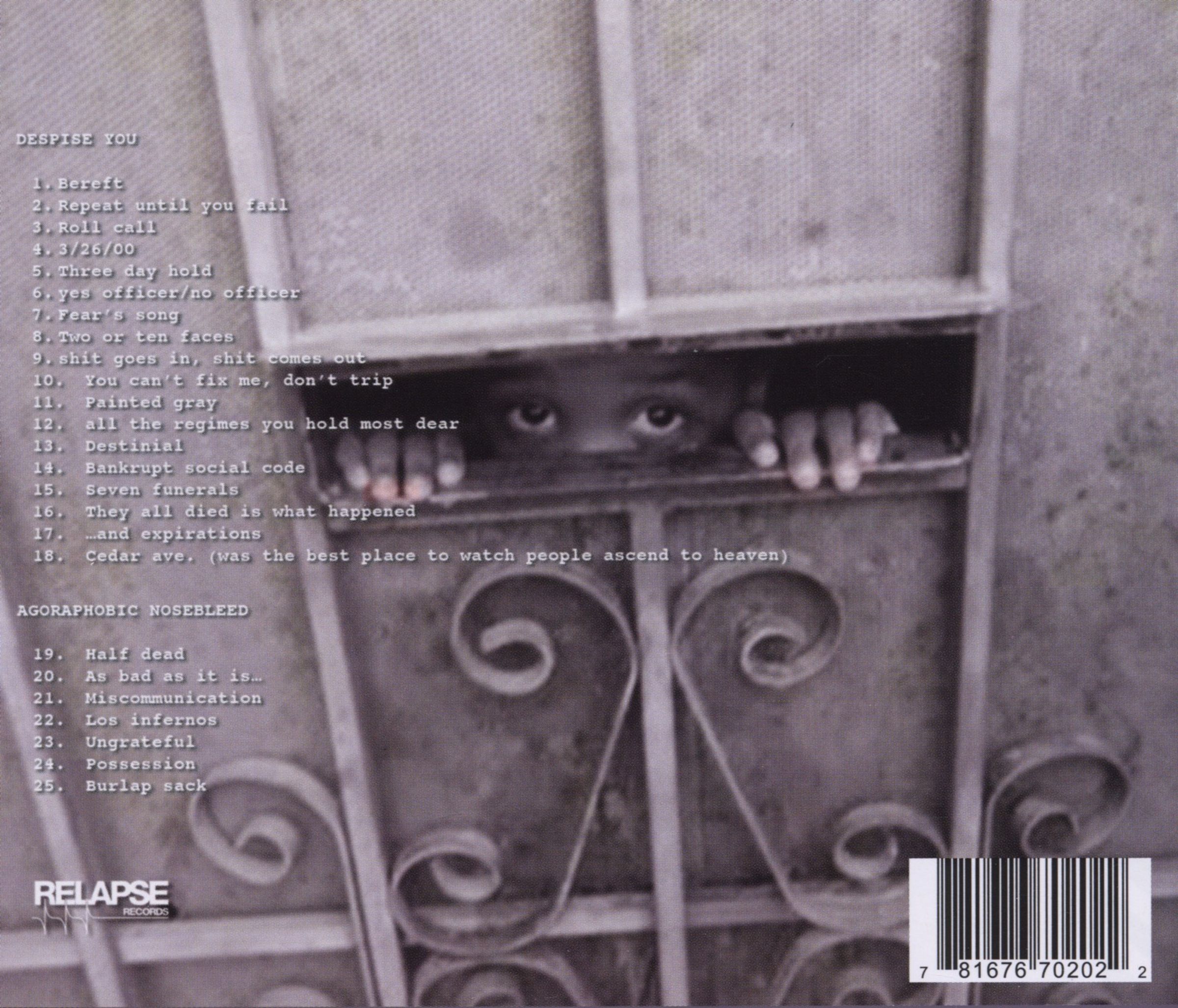 East Coast meets West Coast - eine Full-Length Split-CD der beiden Grindcore-Titanen Agoraphobic Nosebleed und Dispise You. Das Album beinhaltet das erste Musikmaterial von Despise You seit 10 Jahren, 18 großartige Grind-Tracks. Die Grind-Chamäleonen Agoraphobic Nosebleed haben 7 Tracks beigesteuert.