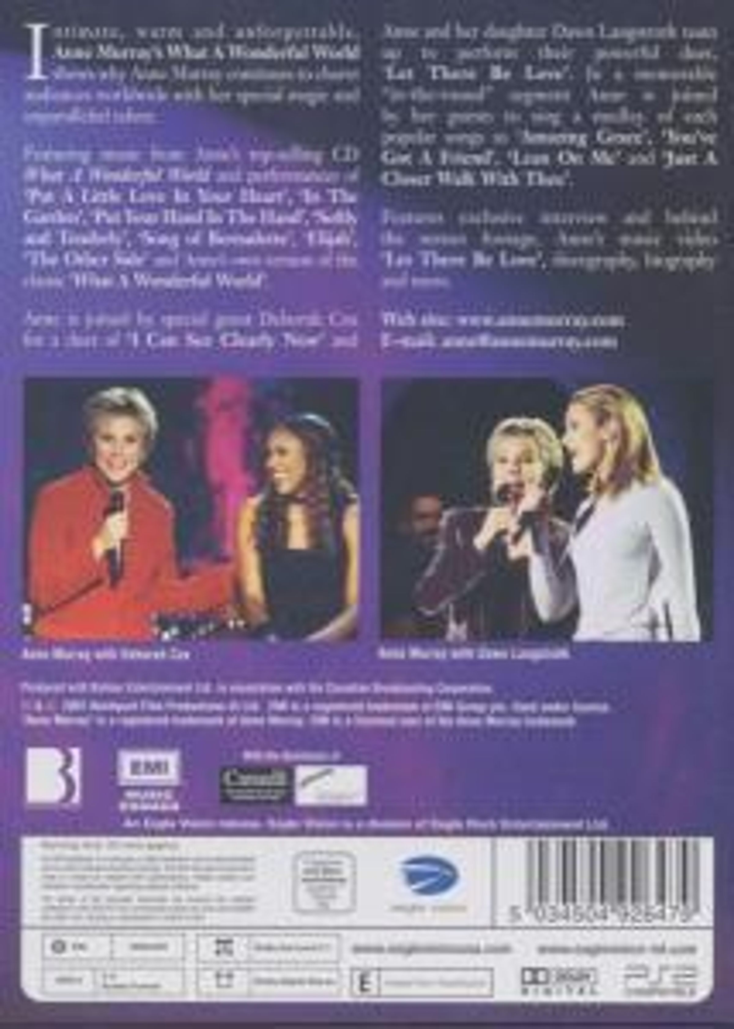 Intimate, warm and unforgettable, Anne Murray's What A Wonderful World shows why Anne Murray continues to charm audiences worldwide with her special magic and unparalleled talent. Featuring music from Anne's top-selling CD What A Wonderful World and performances of Put A Little Love In Your Heart, In The Garden, Put Your Hand In The Hand, Softly and Tenderly, Song of Bernadette, Elijah, The Other Side and Anne's own version of the classic What A Wonderful World. Anne is joined by special guest Deborah Cox for a duet of I Can See Clearly Now and Anne and her daughter Dawn Langstroth team up to perform their powerful duet, Let There Be Love. In a memorable "in-the-round" segment, Anne is joined by her guests to sing a medley of such popular songs as Amazing Grace, You've Got A Friend, Lean On Me and Just A Closer Walk With Thee. Features exclusive interview and behind the scenese footage, Anne's music video Let There Be Love, discography, biography and mor