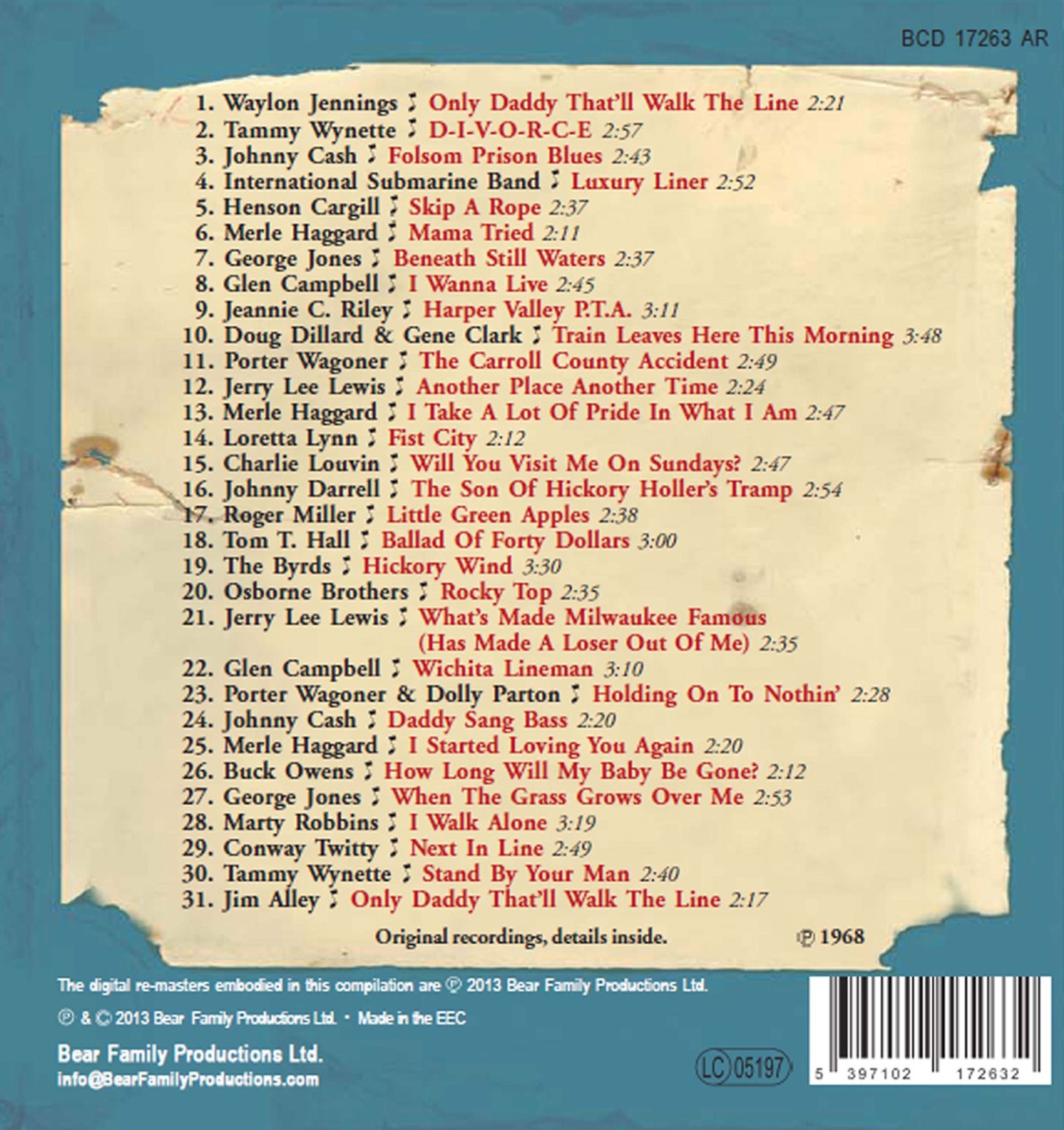 Das neue Paket enthält zu viele Originalfassungen von Hit-Klassikern um sie hier aufzulisten - werfen Sie einen Blick auf die Titelliste! Aber die Serie enthält auch unterbewertete Klassiker und Beinahe-Hits wie Gram Parsons Aufnahmen mit der International Submarine Band und den Byrds, George Jones' oftmals ignoriertes Albumstück Beneath Still Waters (später ein Nummer-Eins-Hit für Emmylou Harris), Charlie Louvins schaurigen Klassiker Will You Visit Me On Sundays, Roger Millers Originalversion von Me And Bobby McGee und Little Green Apples, Jim Alleys ultraseltenes Original von Only Daddy That'll Walk The Line, um nur einige zu nennen! Damit nicht genug!