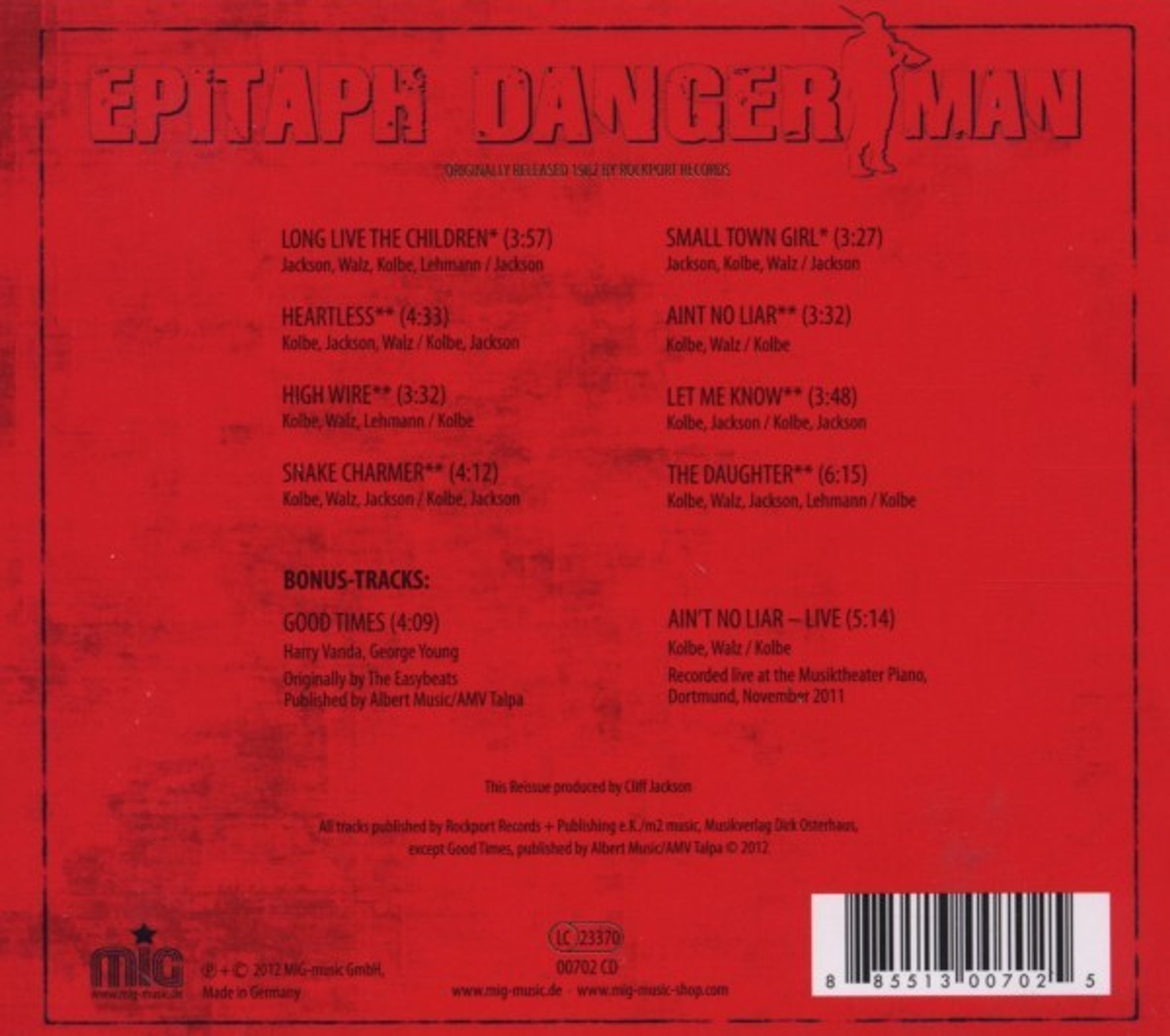 ,,...so wurden für Danger Man alle Krautrock-Überbleibsel eliminiert, gab es stattdessen handfesten Rock in US-Manier zu hören. Zwei höchst unterschiedliche Bonus-Tracks sind neu dazugekommen, mit “Good Times” (The Easybeats) aus dem Jahr 1983 die einzige Cover-Version, die Epitaph je aufgenommen haben, mit “Ain’t No Liar” ein Livemitschnitt aus dem November 2011." (Good Times, Juni / Juli 2012)