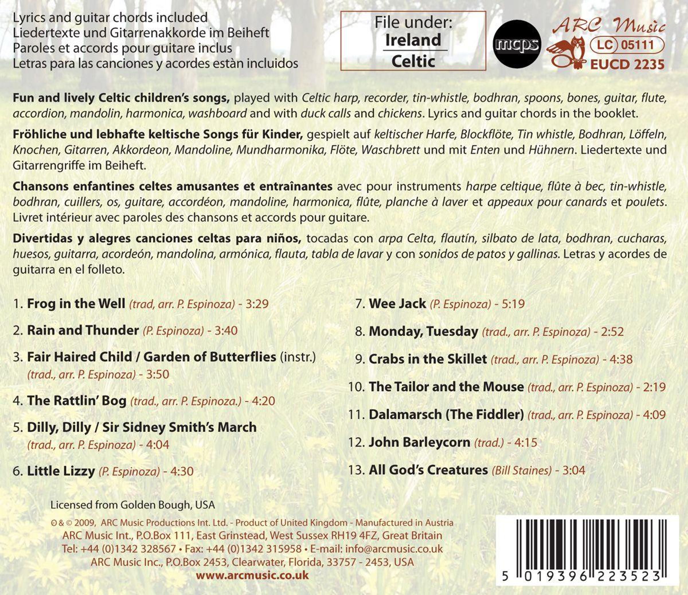 Lustige und lebendige keltische Kinderlieder, gespielt mit keltischer Harfe, Blockflöte, Tin Whistle, Bodhrán, Löffeln, Knochen, Gitarre, Akkordeon, Mandoline, Mundharmonika, Flöte, Waschbrett inklusive Hühner- und Entenrufen. Liedtext und Gitarrenakkorde im 16-seitigen Booklet.