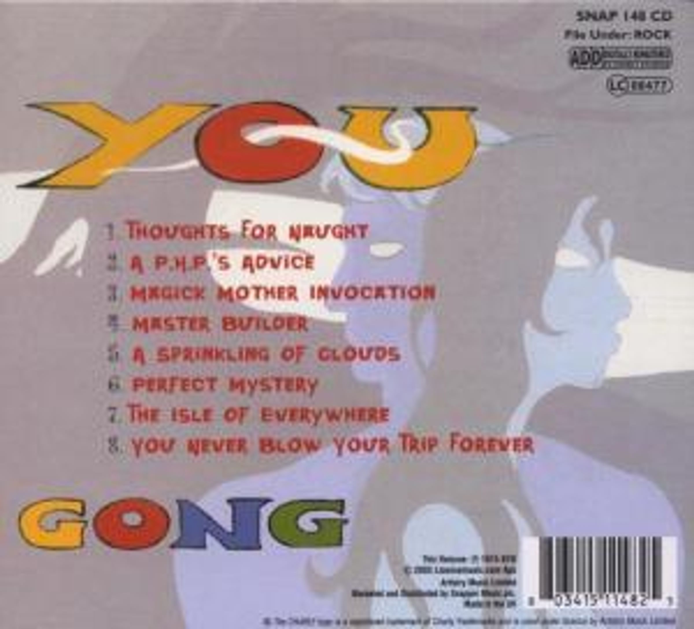 You ist das fünfte Studioalbum von Gong und wurde im Oktober 1974 erstmals veröffentlicht. Nun erscheint die Remastered-Version des Albums, das um eine bisher unveröffentlichte Konzertaufnahme im Londoner Hyde Park im Juni 1974, um eine alternative Version von »A PHP's Advice« und um eine seltene Version von »Where Have All The Flowers Gone?« erweitert wurde. Auf CD 1 der Doppel-CD befinden sich ebenfalls zwei Bonus-Songs.