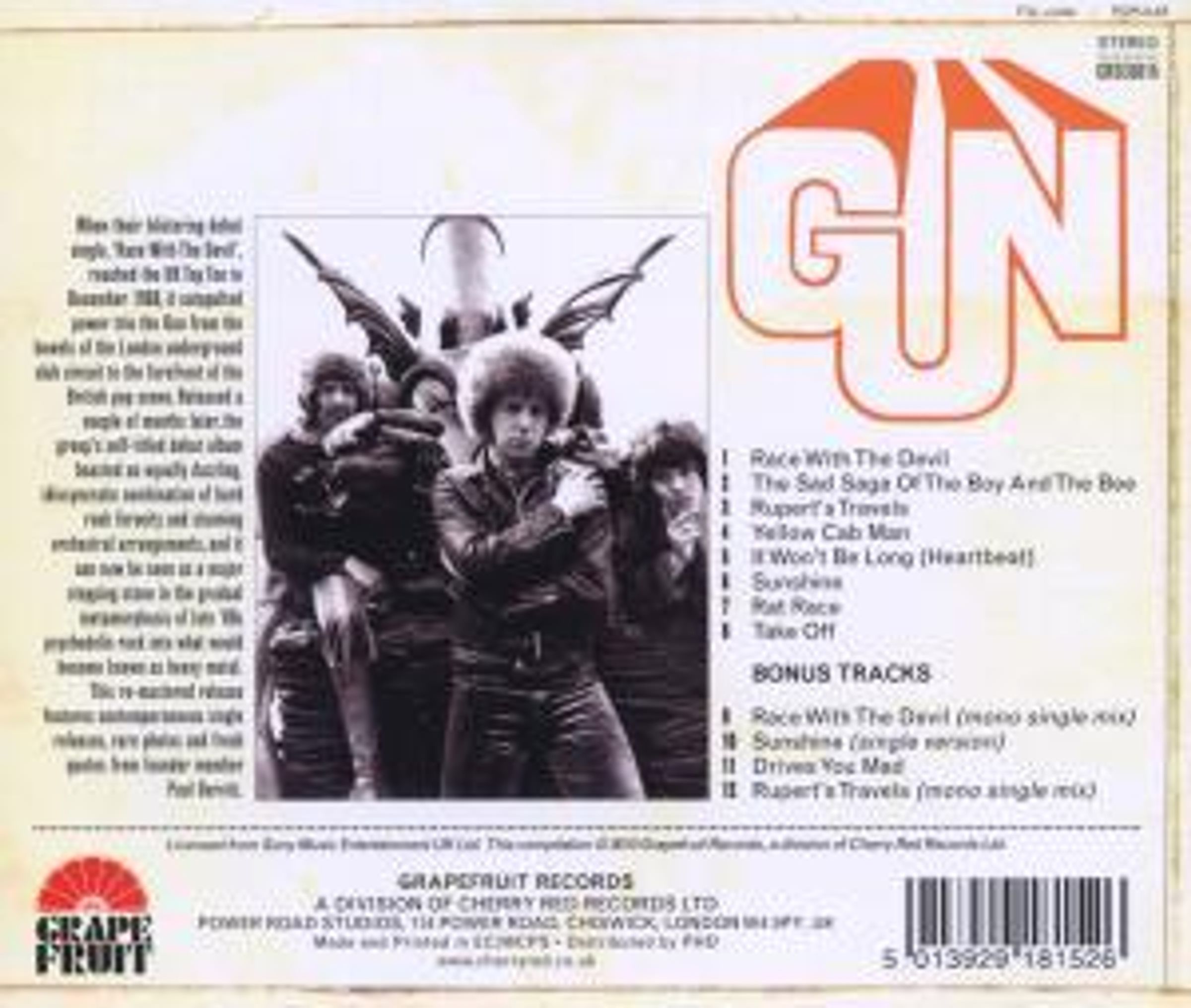 Race With The Devil, reached the UK Top Ten in December 1968, it catapulted power trio the Gun from the bowels of the London underground club circuit to the forefront of the British pop scene. Released a couple of months later, the group s self-titled debut album boasted an equally dazzling, idiosyncratic combination of hard rock ferocity and striking orchestral arrangements, and it can now be seen as a major stepping stone in the gradual metamorphosis of late 60s psychedelic rock into what would become known as heavy metal. This newly re-mastered reissue features contemporaneous single releases, rare photos and fresh quotes from founder member Paul Gurvitz.
