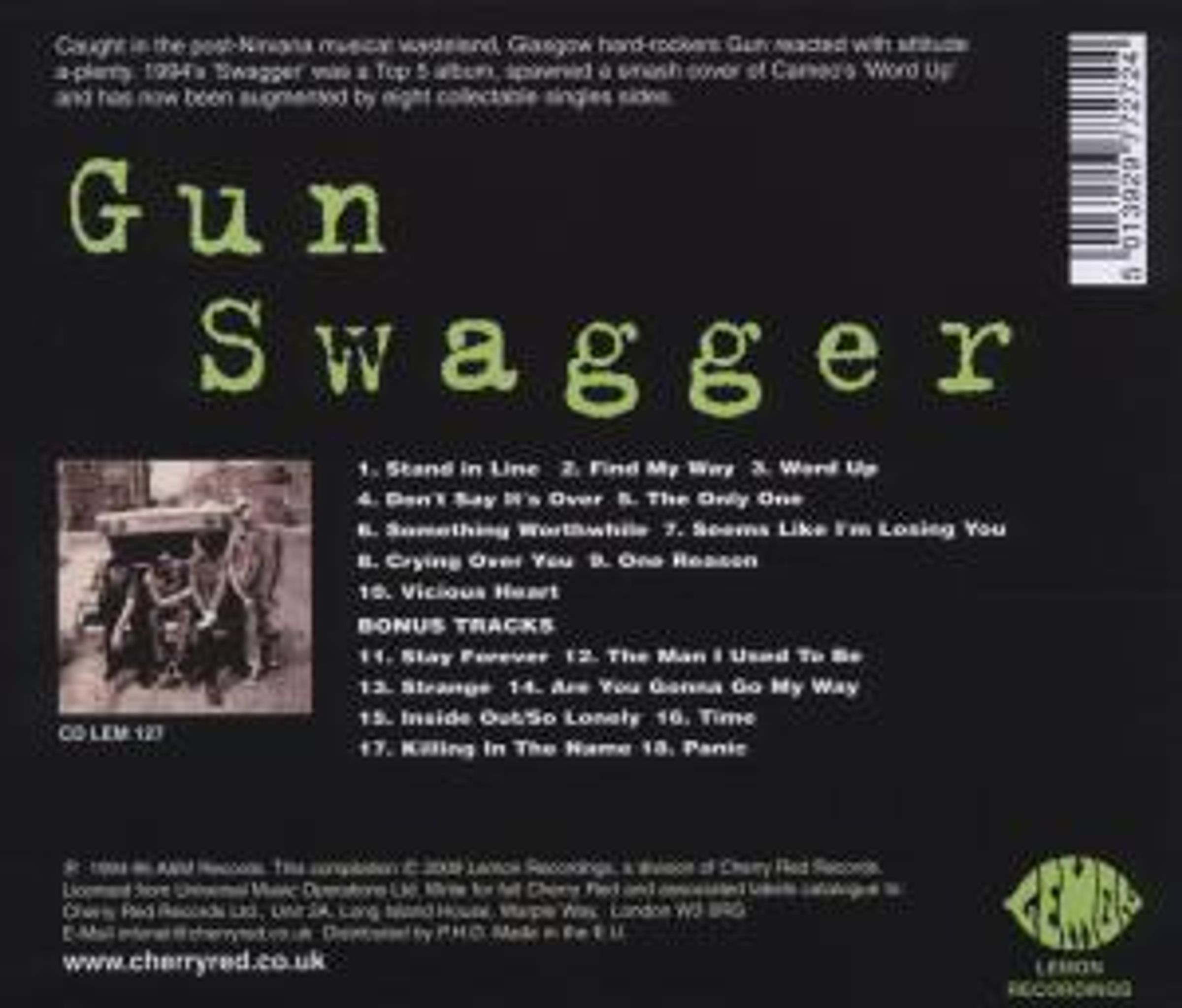 Schottische Hardrocker, deren vier zwischen 1989 und 1997 veröffentlichte Alben alle in die britischen Top 50 kamen. Sie traten als Vorgruppe von Simple Minds und den Rolling Stones auf, bevor sie zum Headliner wurden. Sie gelten als eine der besten schottischen Hardrock-Bands der letzten 20 Jahre. „Swagger“, 1994 veröffentlicht, erreichte Platz 5 und war ihr erfolgreichstes Album. Das Album enthält acht Coverversionen von Rockklassikern von Police, Lenny Kravitz, Rage Against the Machine usw., die auf drei limitierten Single-CDs versteckt waren und lange nicht erhältlich waren. Gun haben sich vor Kurzem mit dem neuen Sänger Toby Jepson (Little Angels) wiedervereinigt. Enthält drei Top-30-Singles: „Don't Say It's Over“, „The Only One“ und das Top-5-Cover von Cameos „Word Up!“.