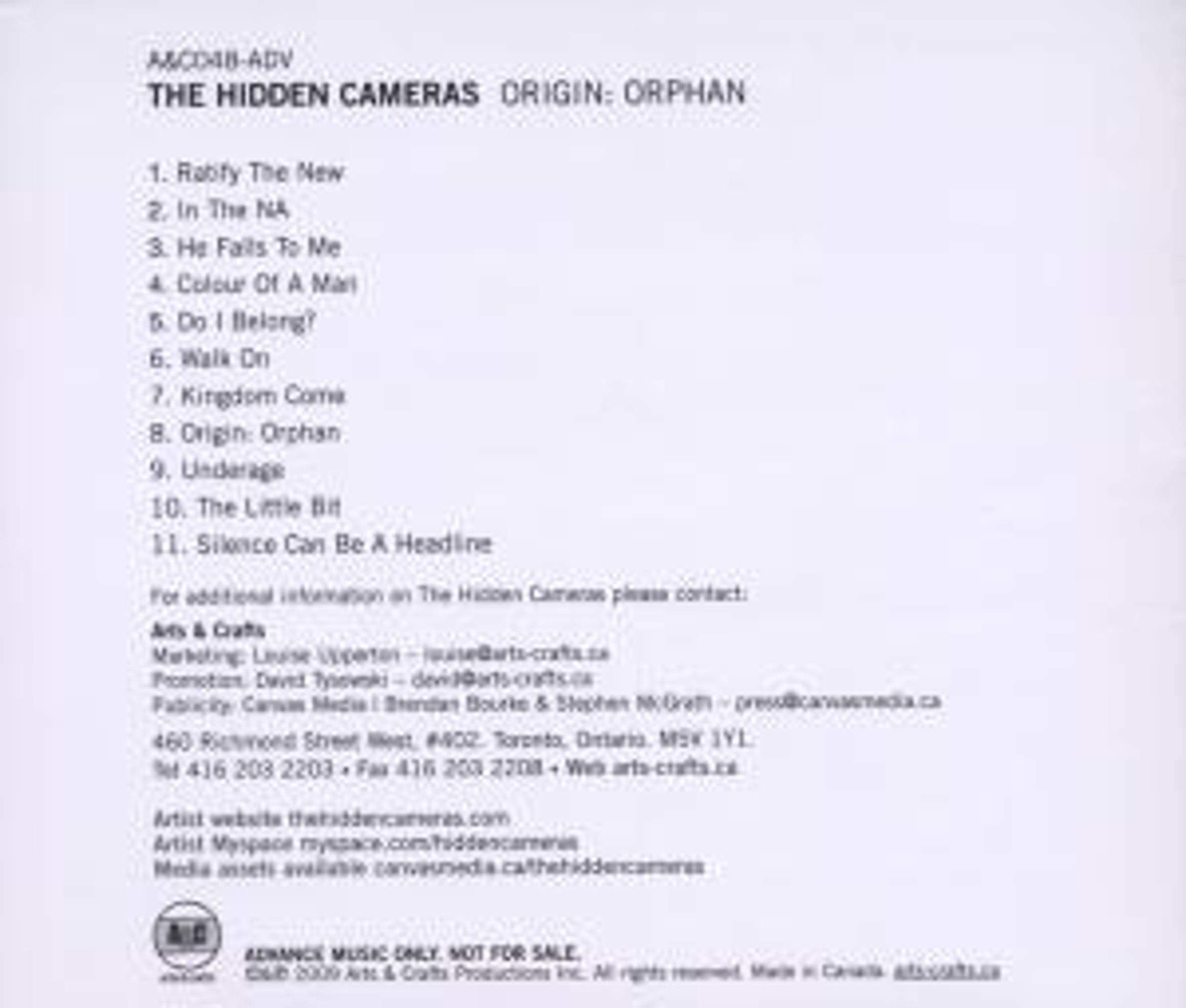 The Hidden Cameras stehen für homoerotische Gute-Laune-Musik dank einer wilden Mixtur von Folk-Anleihen, Gospelanklängen und den Lyrics und der wunderbaren Stimme von Sänger Noel Gibb. 2003: Das Debütalbum »The Smell of your Own« findet international großen Anklang. Im Juli 2004 erscheint das Nachfolgealbum »Mississauga Goddam« und steht dem brillianten Debüt in nichts nach. Seit 2005 lebt Gibb nun in Berlin, wo er sich unter anderem der Malerei und natürlich den grossartigen Songs und Videos der Hidden Cameras widmet. Jetzt ist endlich das neue Album »Origin: Orphan« erschienen.