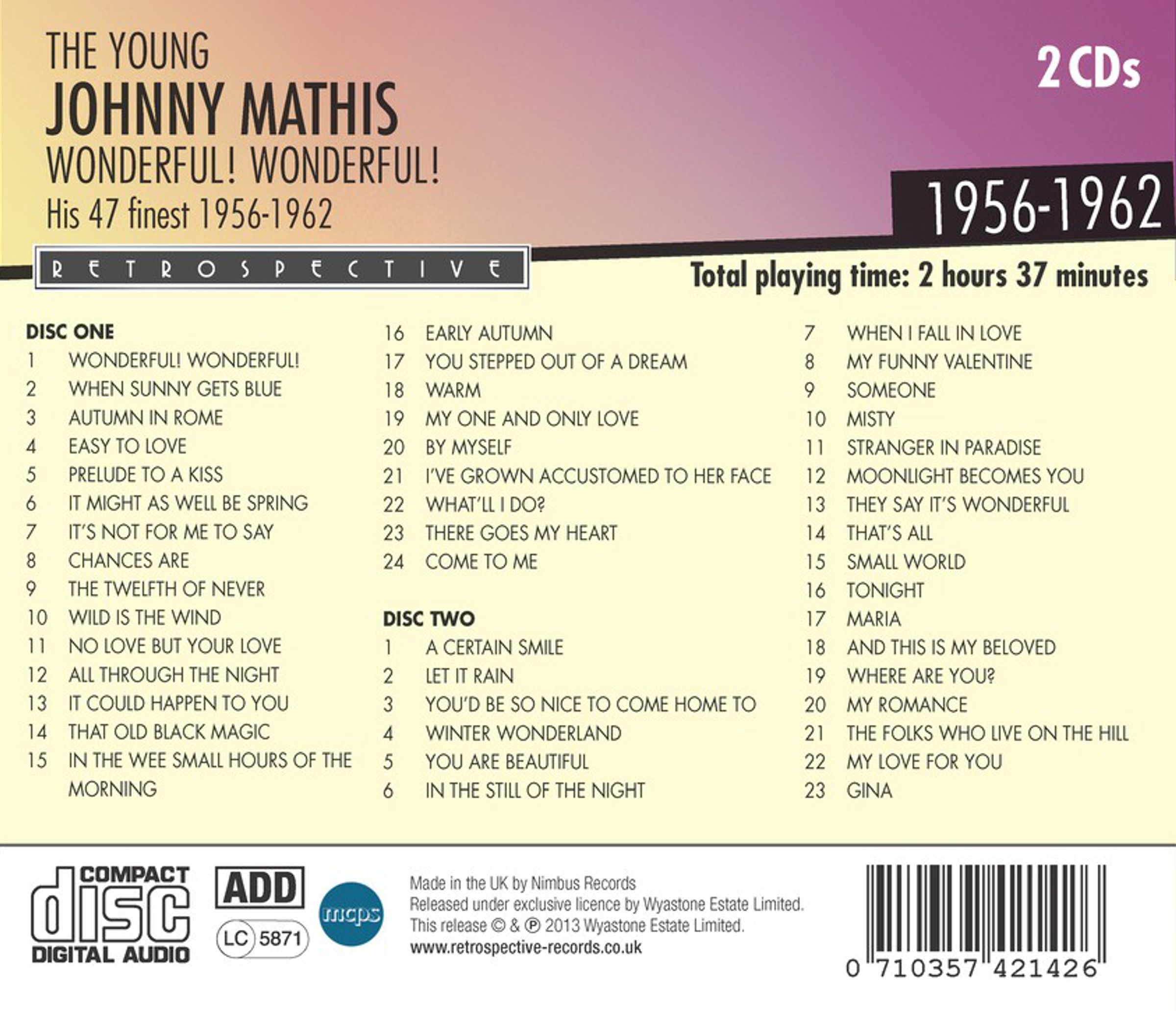 Obwohl es keinen Mangel an Mathis-CDs gibt, ist »Wonderful! Wonderful!« von Retrospective einzigartig, da es eine Essenz des stimmlichen Zaubers bietet, den Mathis in seinen Zwanzigern ausübte. Hier finden sich nicht nur die unverwechselbaren Hits – »Misty«, »Chances Are«, »A Certain Smile«, »It's Not For Me To Say« und so weiter –, sondern auch eine glühende Abfolge der besten Evergreens aus dem großartigen American Songbook in unvergleichlichen Interpretationen.
