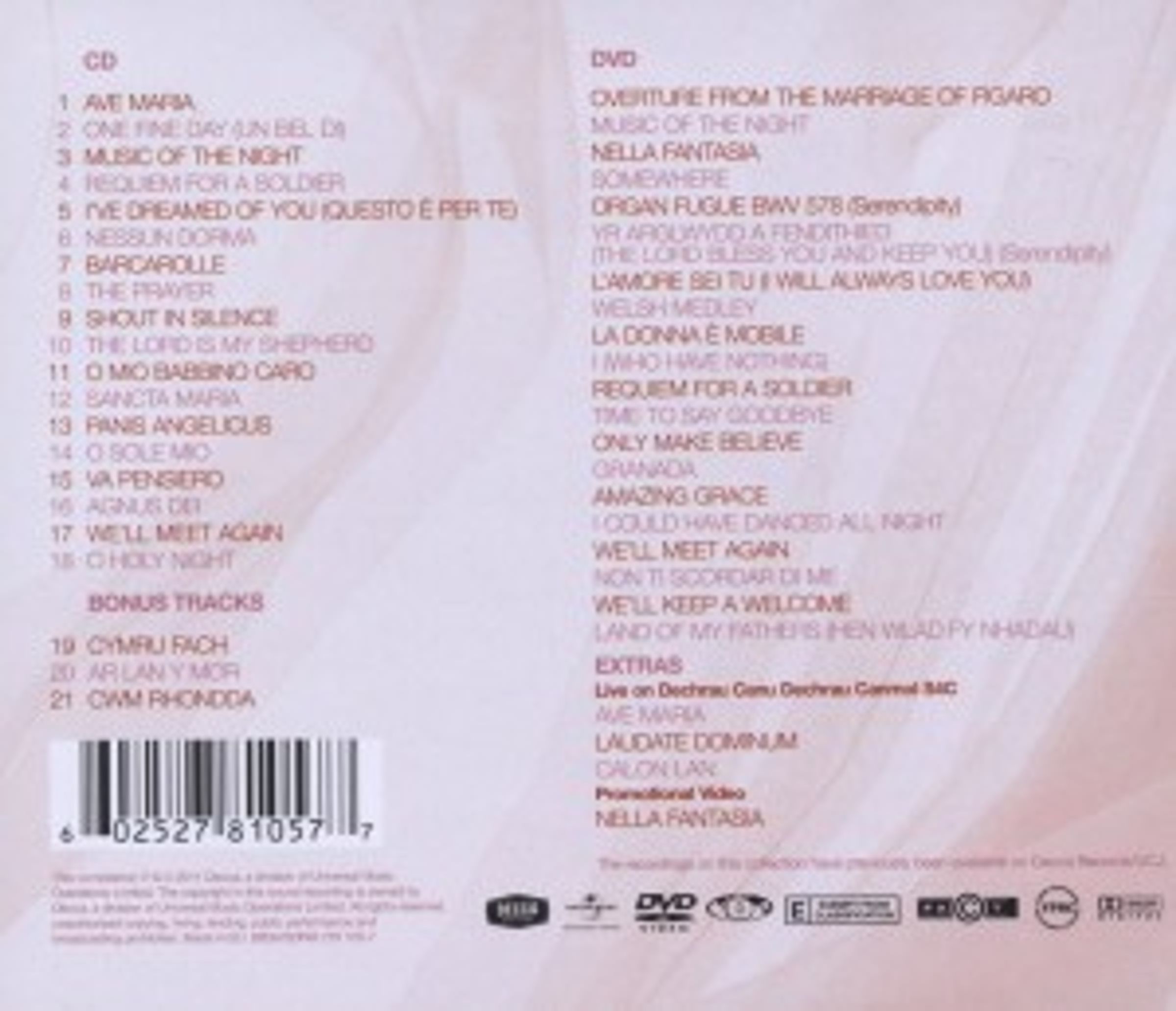 1 CD vollgepackt mit bekannten Songs + 3 Bonus-Tracks sowie eine Bonus-DVD mit dem gefeierten Konzert "Katherine in the Park", das zum ersten Mal in Deutschland veröffentlicht wird. Ein Wiederhören und -sehen mit der umwerfenden, jungen Waliserin (geb. 1980) und ihren größten Erfolge, u. a. Time To Say Goodbye, Somewhere, Ave Maria und La donna é mobile.