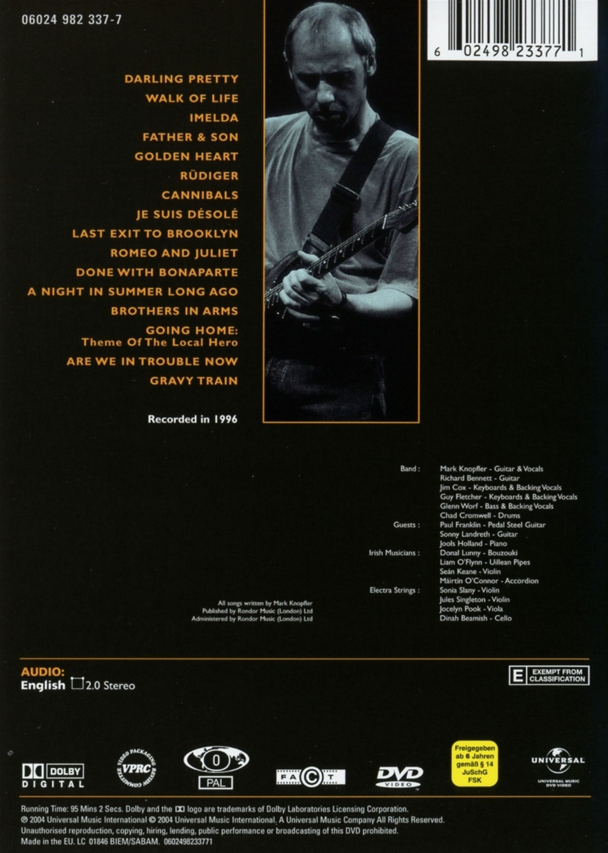„Mark Knopfler: A Night in London, Recorded in 1996“. Ein Mann in rotem Hemd spielt Gitarre. Links unten DVD-Logo., DVD