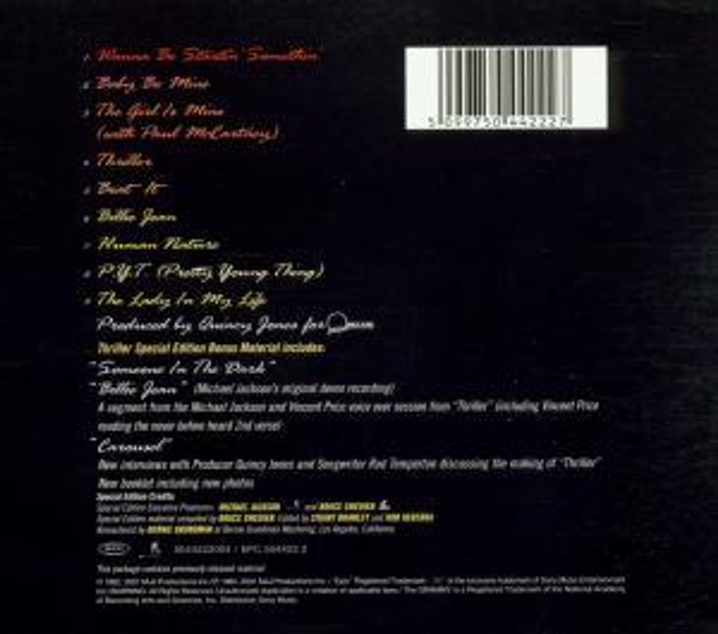 C. Hammer in stereoplay 12/01: "Die "Deluxe Editions" wurden unter Leitung von Michael Jackson selbst sowie Toningenieur Bruce Swedien soundtechnisch auf den aktuel- len Stand gebracht und überzeugen mit deutlich hörbarem Plus an Präsenz, Druck und Knackigkeit, punkten optisch durch aufwendige neue Booklets. Nicht nur Fan- und Samm- lerherzen dürfen hier schneller schlagen, auch normale Musikfreunde freuen sich über eine angemessene Restau- rierung von wichtigen bis wegweisenden Produktionen der Popgeschichte." ROLLING STONE ALBUM GUIDE ***** "'Thriller' widens the stylistic net further; it's mainstream in the very best sense of the word. "Thriller" sums up and celebrates Jackson's now larger-than-life appeal, while "Billie Jean" hauntingly examines its psychosexual toll on this former child star."Disk 1 von 1 (CD)