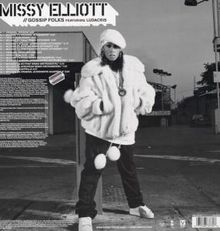 „MISSY ELLIOTT // GOSSIP FOLKS featuring LUDACRIS.“ Frau in weißem Pelzmantel und Mütze, urbaner Hintergrund., 2 LPs