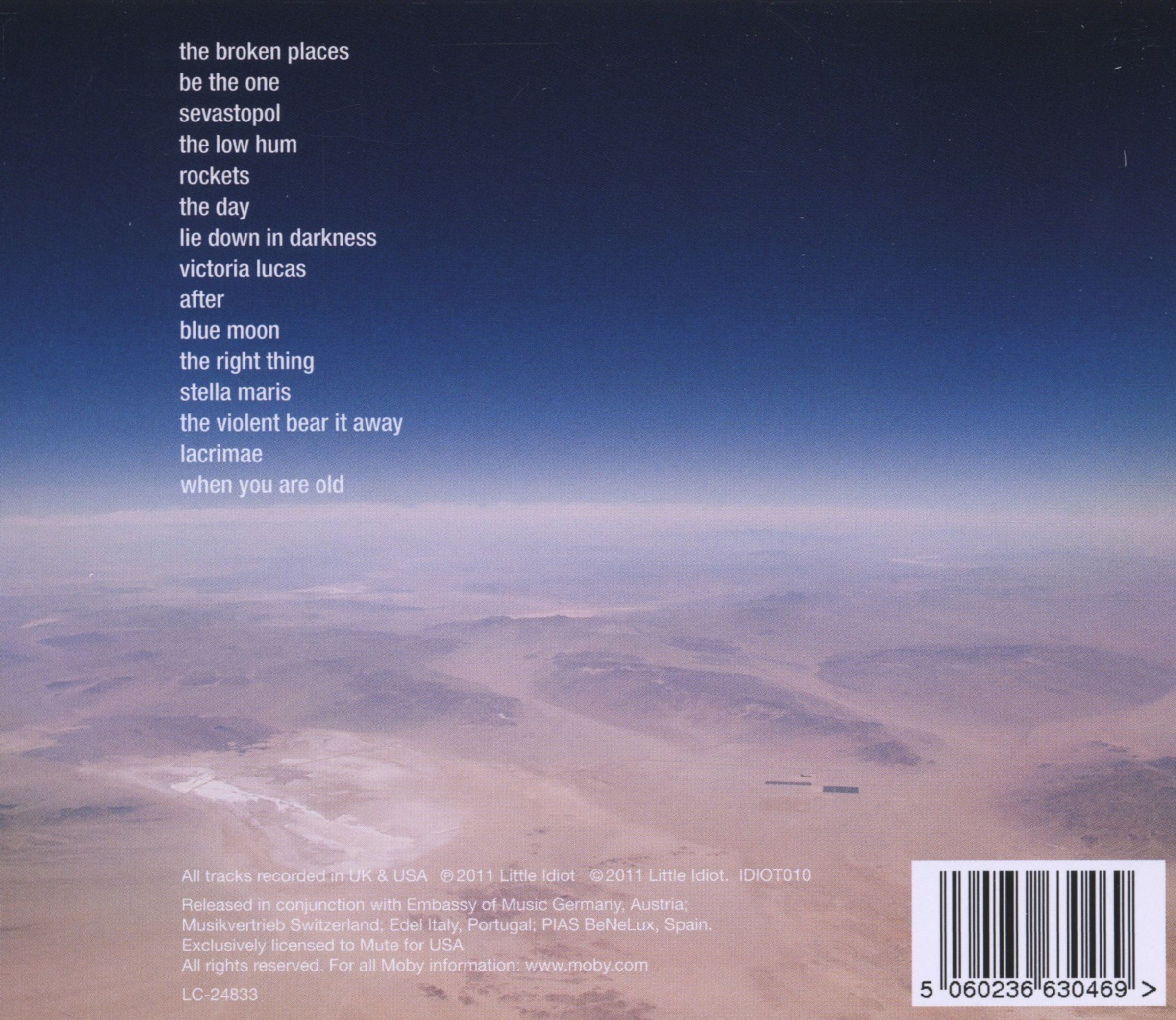 so, the title: 'destroyed'. i was in laguardia airport and my flight was delayed and i was wandering around and i saw a small sign that said 'unattended luggage will be destroyed', but the sign only fit one word at a time so i waited until it read 'destroyed' and i took a picture and somehow the picture and the title make sense to me when i listen to the music on the album and when i look at the other pictures in the book and yes this is a huge long run on sentence about the title and cover image of the book and album but i like run on sentences because they remind me of 'a prayer for owen meany' by john irving. (moby.com)