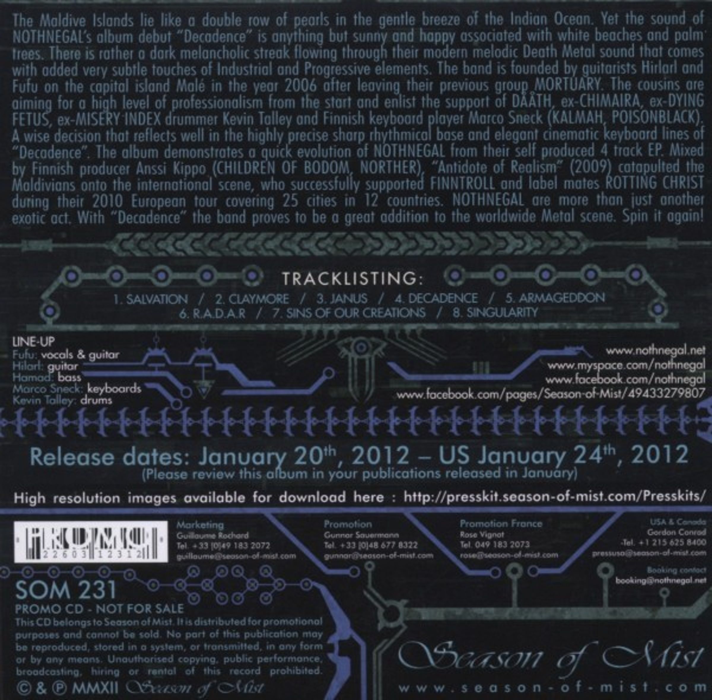„Decadence“, das Longplay-Debüt der Malediver Nothnegal, hat nicht mehr viel gemeinsam mit der EP „Antidote Of Realism“ von 2009. Sänger Avo hat die Band verlassen und wird inzwischen von Gitarrist Fufu ersetzt, und stilistisch orientiert sich das Melodic-Death-Quintett (zu dem auch Poisonblack-Keyboarder Marco Sneck und Daath-Schlagzeuger Kevin Talley gehören) stärker als zuvor in Richtung Thrash- und Progressive