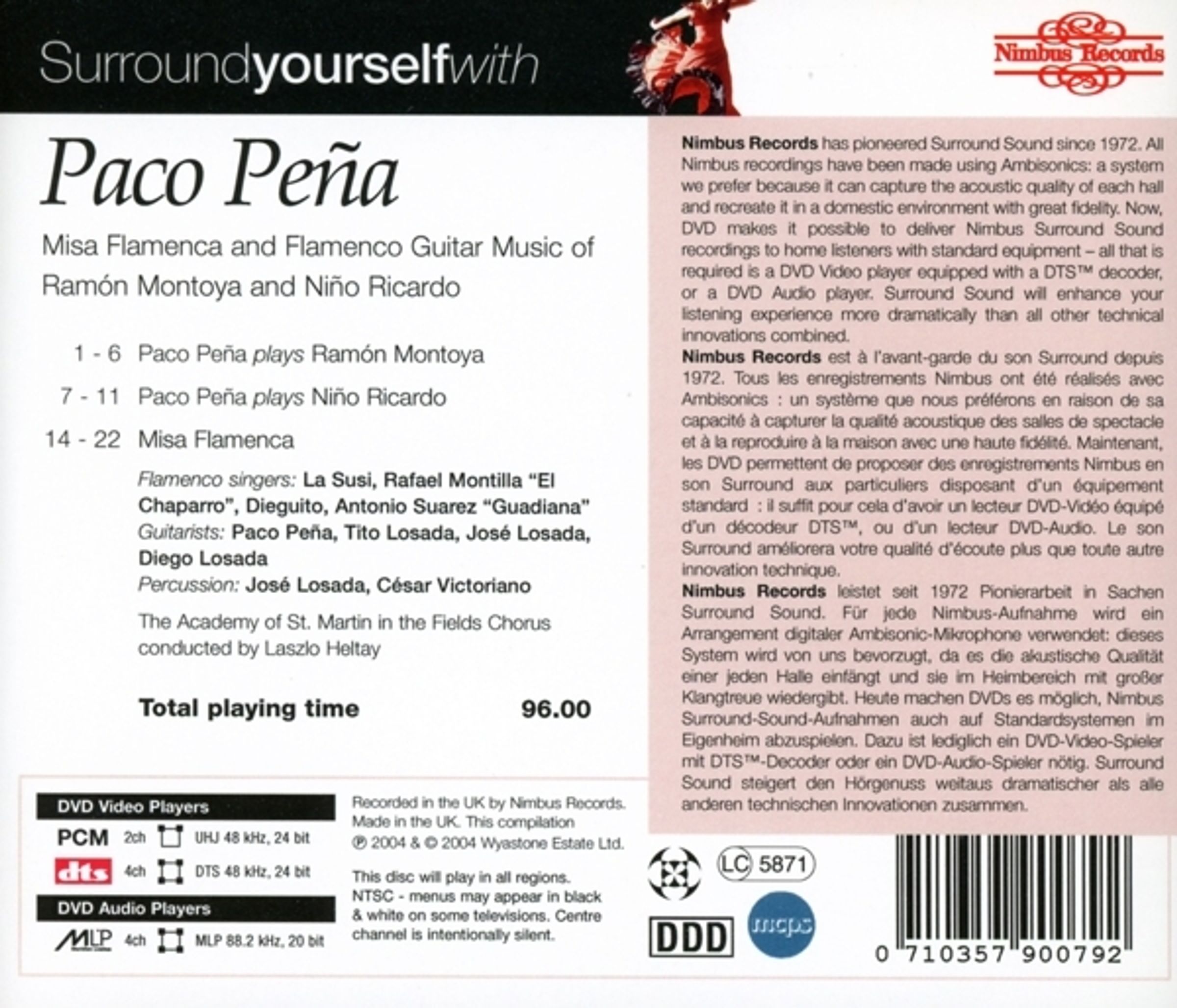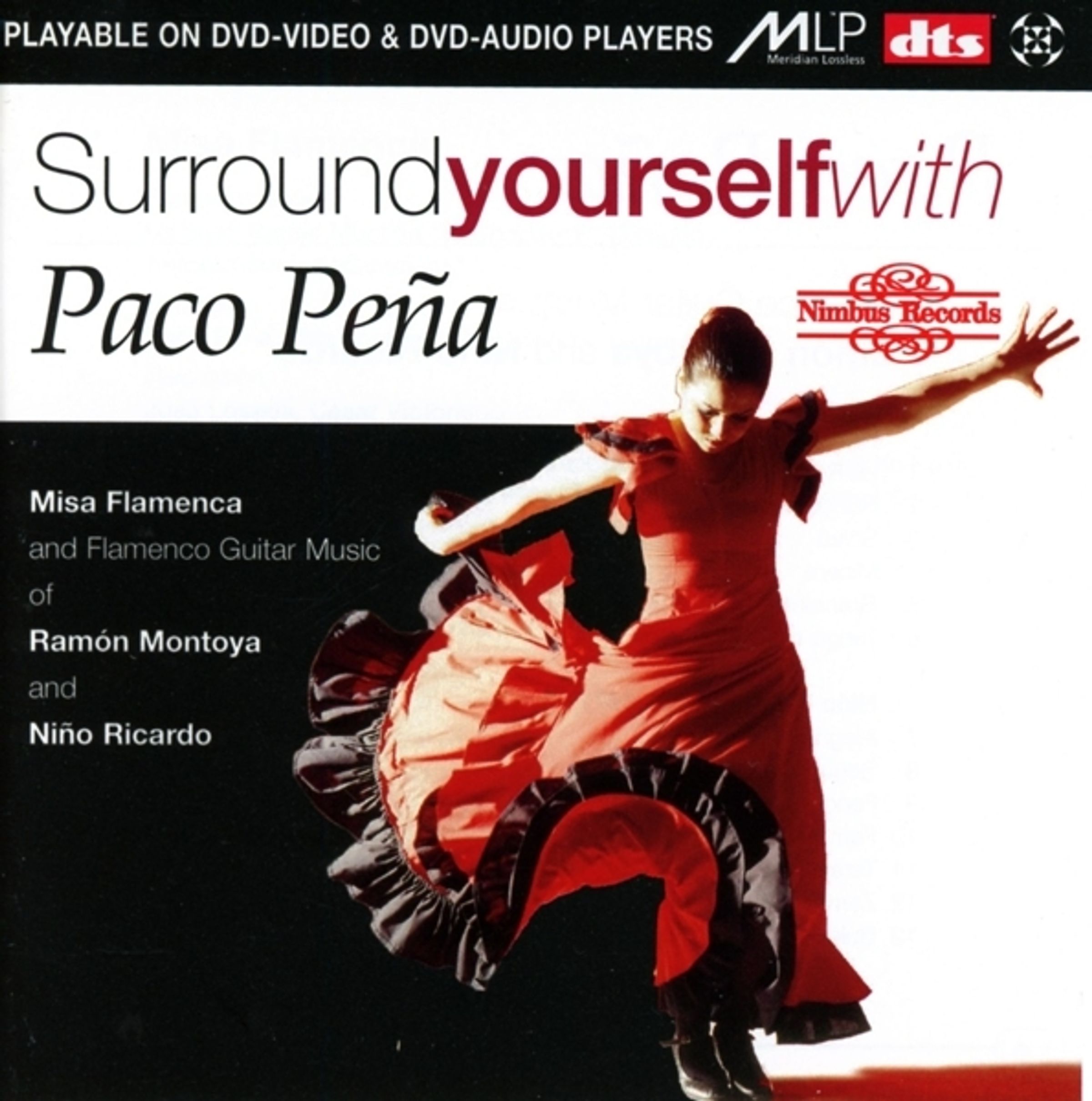 "Surround yourself with Paco Peña", Nimbus Records-Logo, Tänzerin in rotem Flamenco-Kleid, dynamische Pose., DVD-Audio