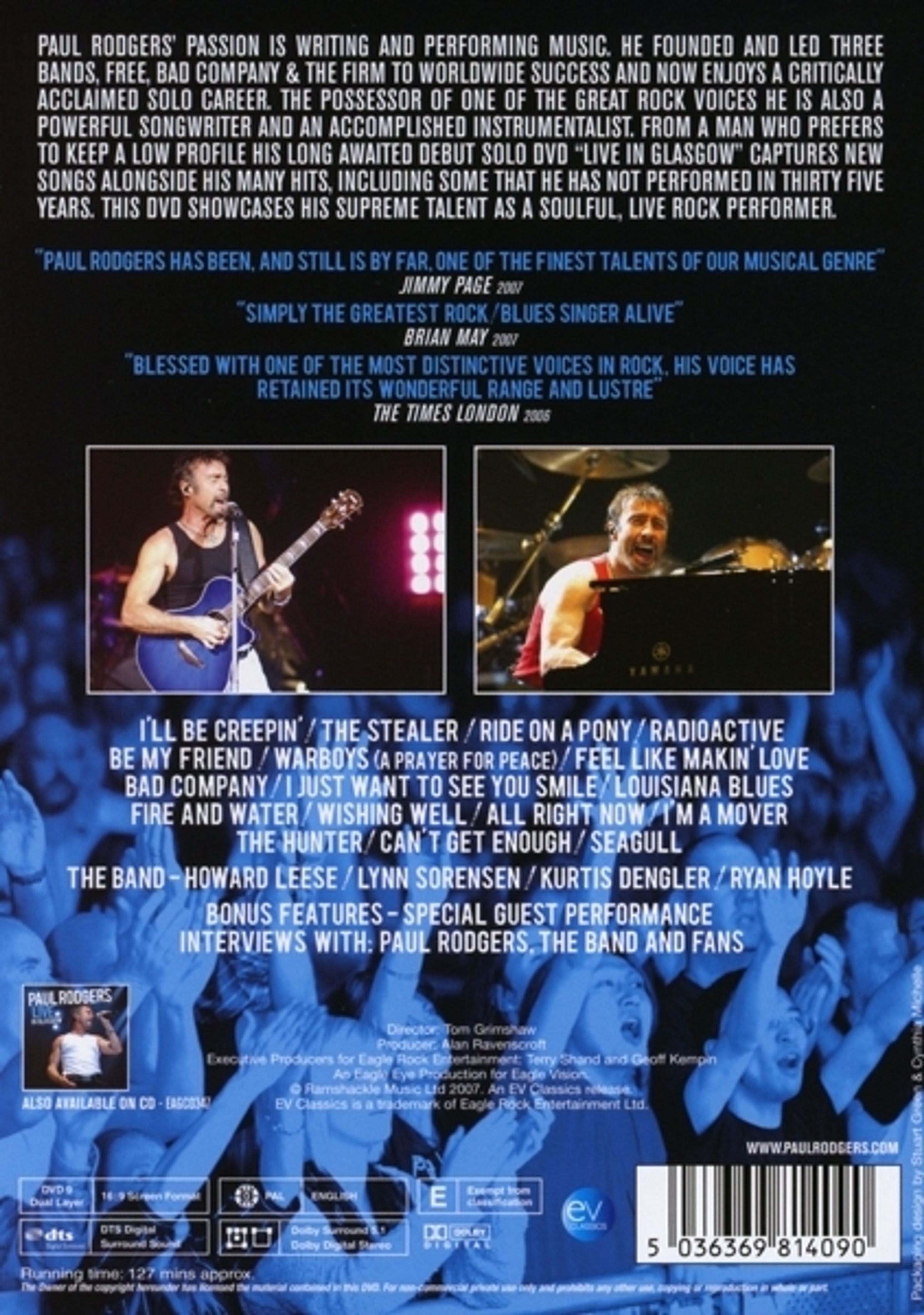 Paul Rodgers' passion is writing and performing music. He founded and led three bands. Free, Bad Company & The Firm to worldwide success and now enjoys a critically acclaimed solo career. The possessor of one of the great rock voices he is also a powerful songwriter and an accomplished instrumentalist. Form a man who prefers to keep a low profile his long awaited debut solo DVD "Live in Glasgow" captures new songs alongside his many hits, including some that he has not performed in thirty five years. This DVD showcases his supreme talent as a soulful, live rock performer.