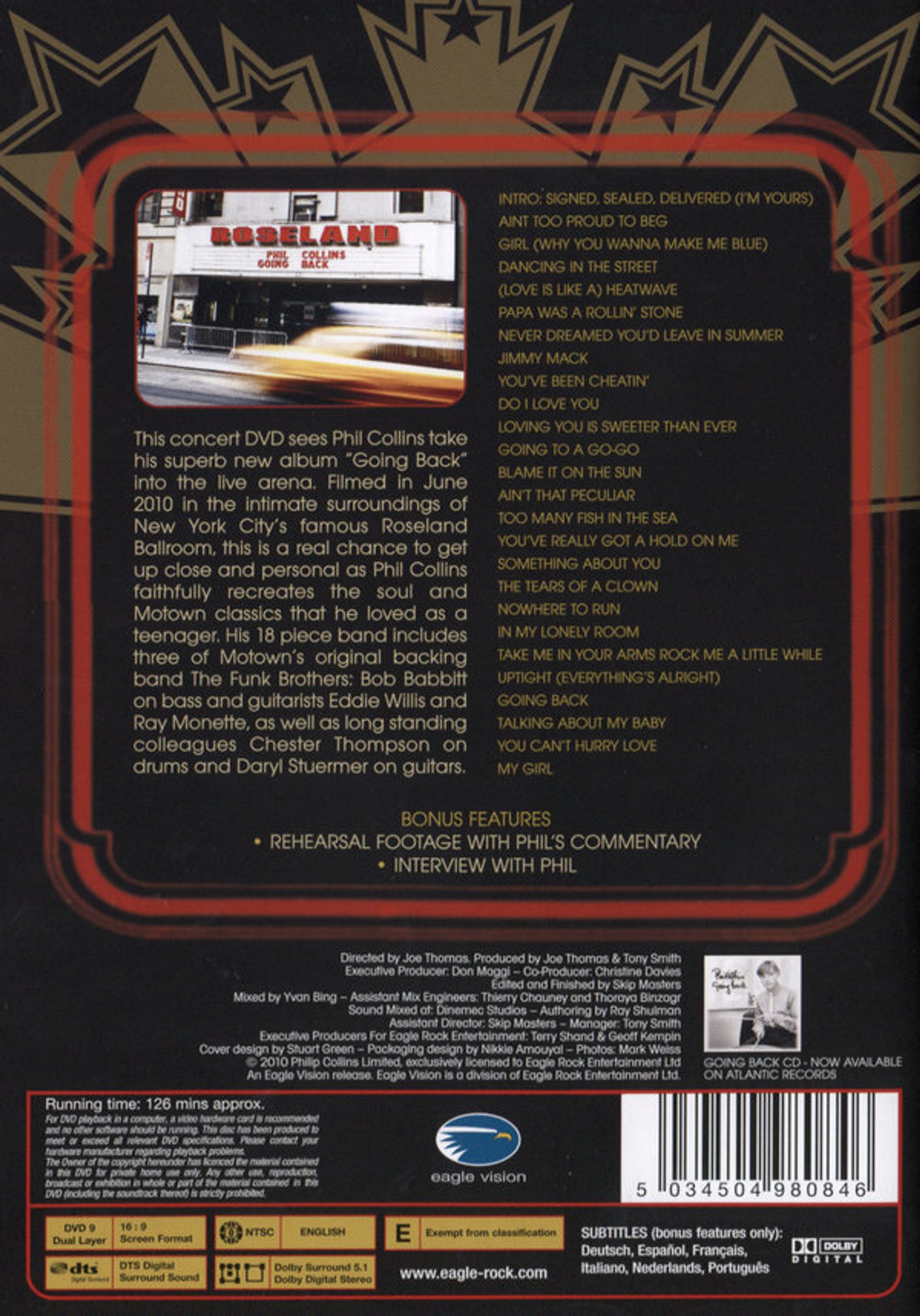 ,,Die DVD und Blu-ray ,,Going Back - Live At Roseland Ballroom NYC" zeigt eines der Konzerte in intimen Rahmen und überrascht mit einem äußerst lässigen, souveränen Collins in ungewohnt eleganter Abendgarderobe. Live wie auch im Studio lag dem Genesis-Frontmann daran, den Motown-Sound möglichst originalgetreu zu reproduzieren - und es gelingt trotz seiner untrüglich weißen und obendrein britischen Stimme." (audio, 01 / 2011)