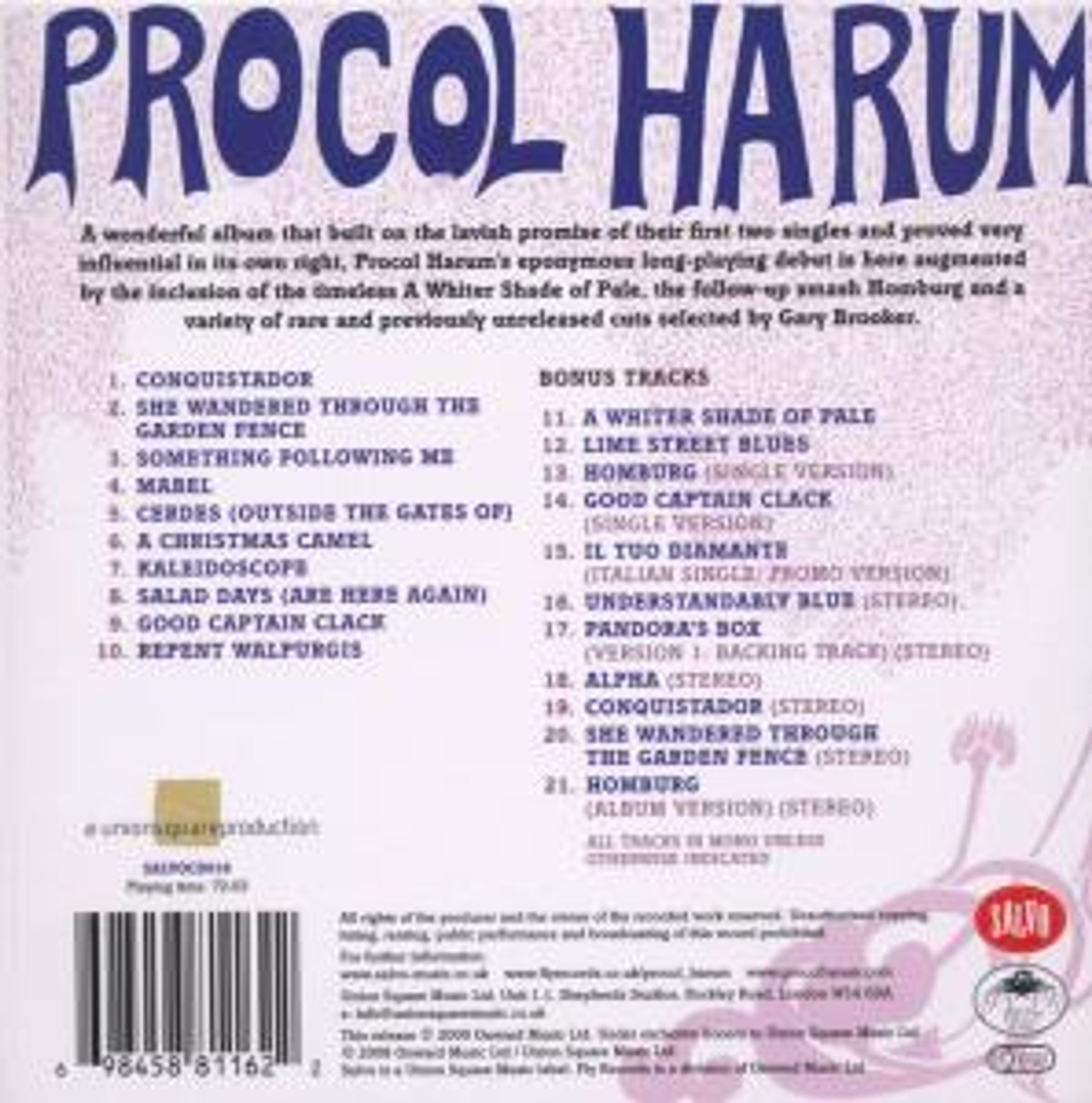 A wonderful album that built on the lavish promise of their first two singles and proved very influential in its own right, Procol Harum’s eponymous long-playing debut is here augmented by the inclusion of the timeless A Whiter Shade of Pale, the follow-up smash Homburg and a variety of rare and previously unreleased cuts selected by Gary Brooker.