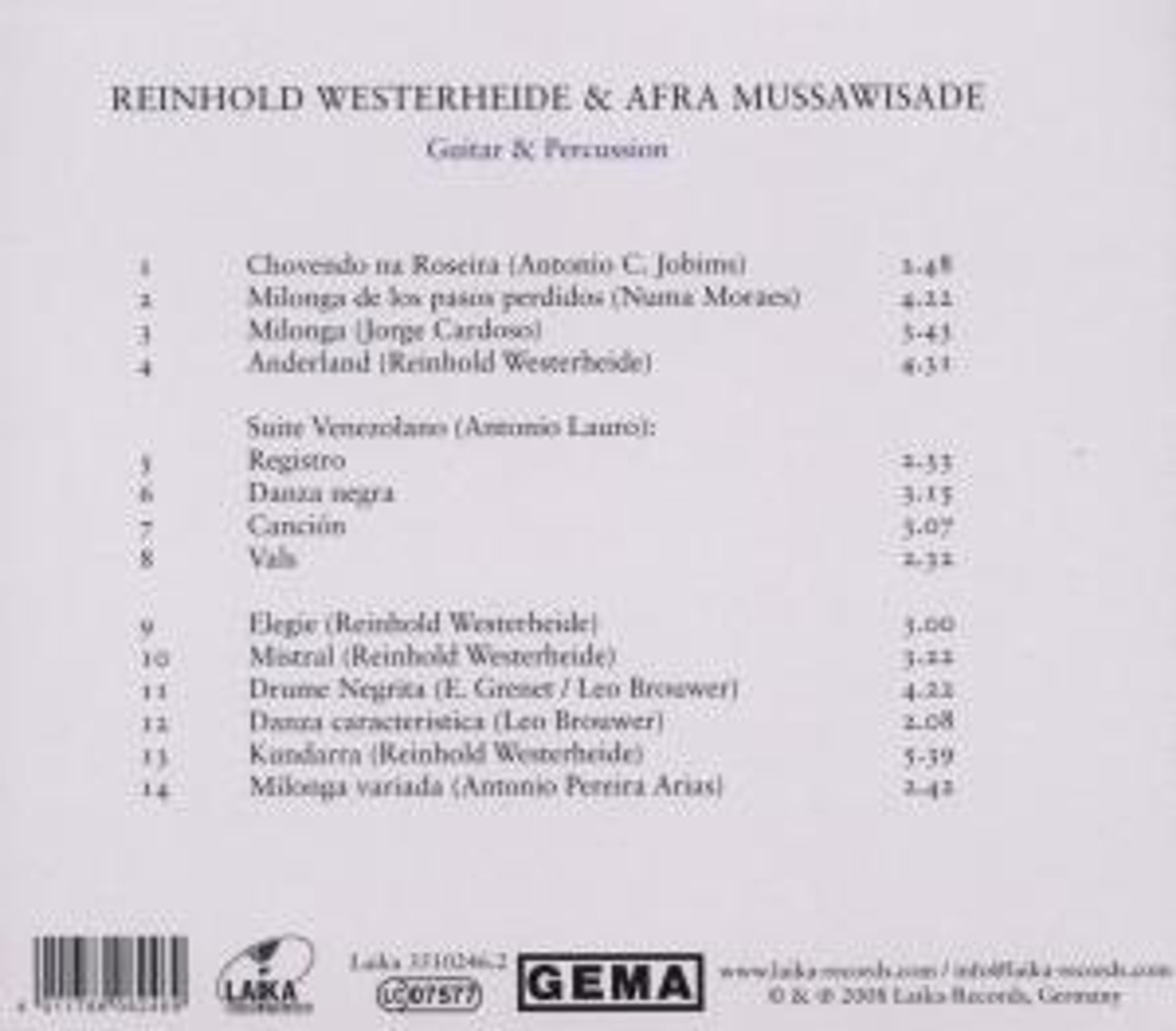 Reinhold Westerheide studierte am ‚Koninklijk Conservatorium' in Den Haag Gitarre (bei Antonio Pereira Arias) und Schlagwerk und absolvierte beide Studiengänge mit dem Konzertexamenabschluß. Er ist ein Weltmusiker im Sinne des Wortes. Als Mitglied des holländischen ‚Circle Percussion' Ensembles begleitete er u. a. das weltberühmte ‚Nederlands Danstheater' rund um den Globus, in Japan gab er Gastspiele mit der Trommelgruppe ‚Kodo'. Eine Reihe ihm gewidmeter Werke von namhaften, vor allem niederländischen Komponisten brachte er auf der Gitarre zur Uraufführung und immer beindruckte und beinflußte ihn der musikalische Reichtum Südamerikas.
