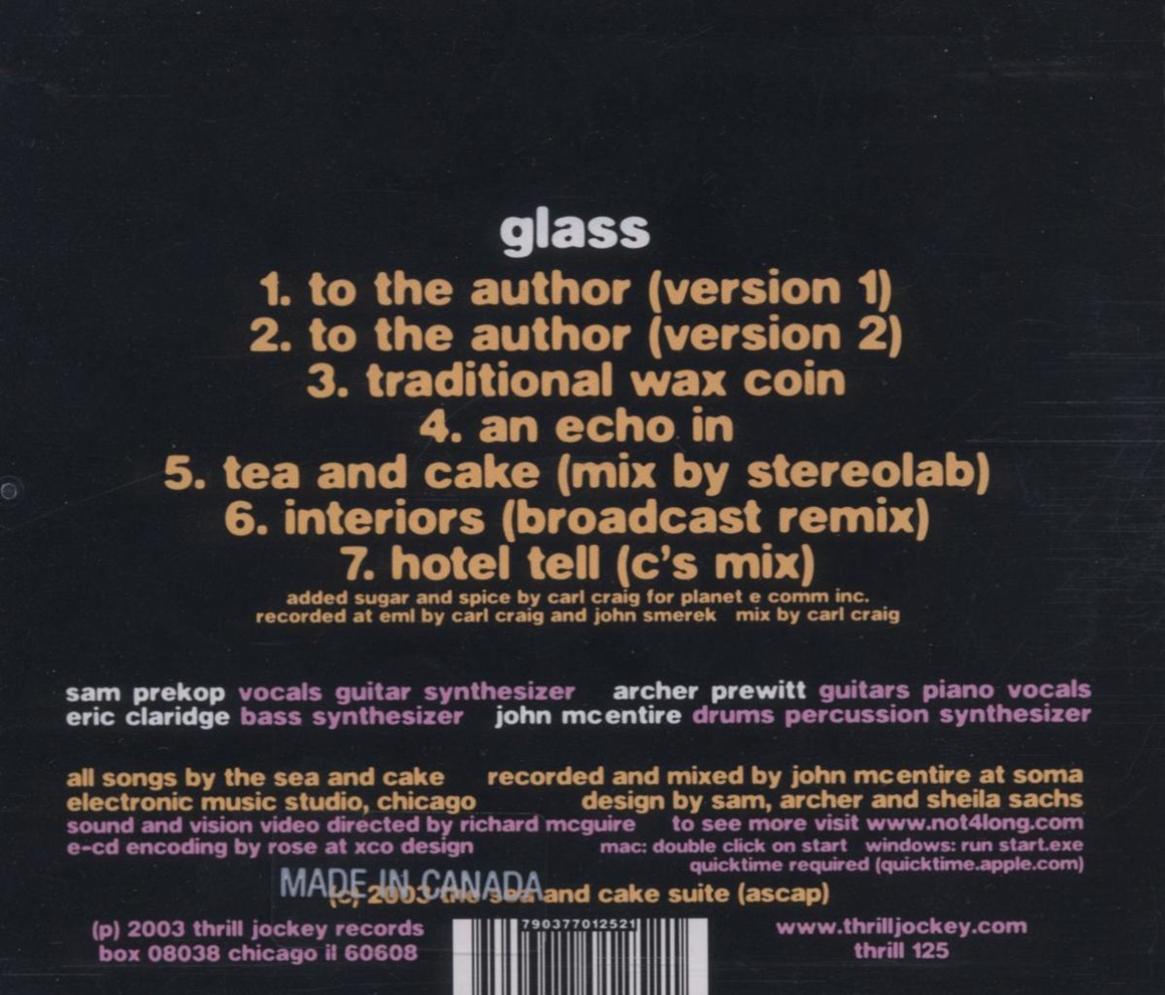 Recorded shortly after completing One Bedroom, Glass immediately proves to be a departure form the classic Sea & Cake song writing style. Certainly a surprise for those who think they have come to know what to expect from The Sea and Cake, the album opens with a double dose of "To the Author" with the second stripped down and reprogrammed version serving as an extension of the first. The two songs back to back lend the favor of showcasing John McEntire’s considerable production skills while uncovering a new found patience with allowing the instrumental song structure to develop unto itself. Prekop’s dulcet toned vocal styling helps separate the two personalities on each version via unique delivery and enunciation. "Traditional Wax Coin" follows and features Prewitt on piano submersed in McEntire’s backdrop of beats; here the band is at perhaps their most experimental moment to date. The fourth track on Glass, "An Echo In," has acquired acclaim from European and nationwide audiences alike after performances at London’s Union Chapel, as well as on the most recent US tour. Built upon a propulsive synthesizer line, Prekop delivers the perfect companion with sleepy vocals and a compelling story line.