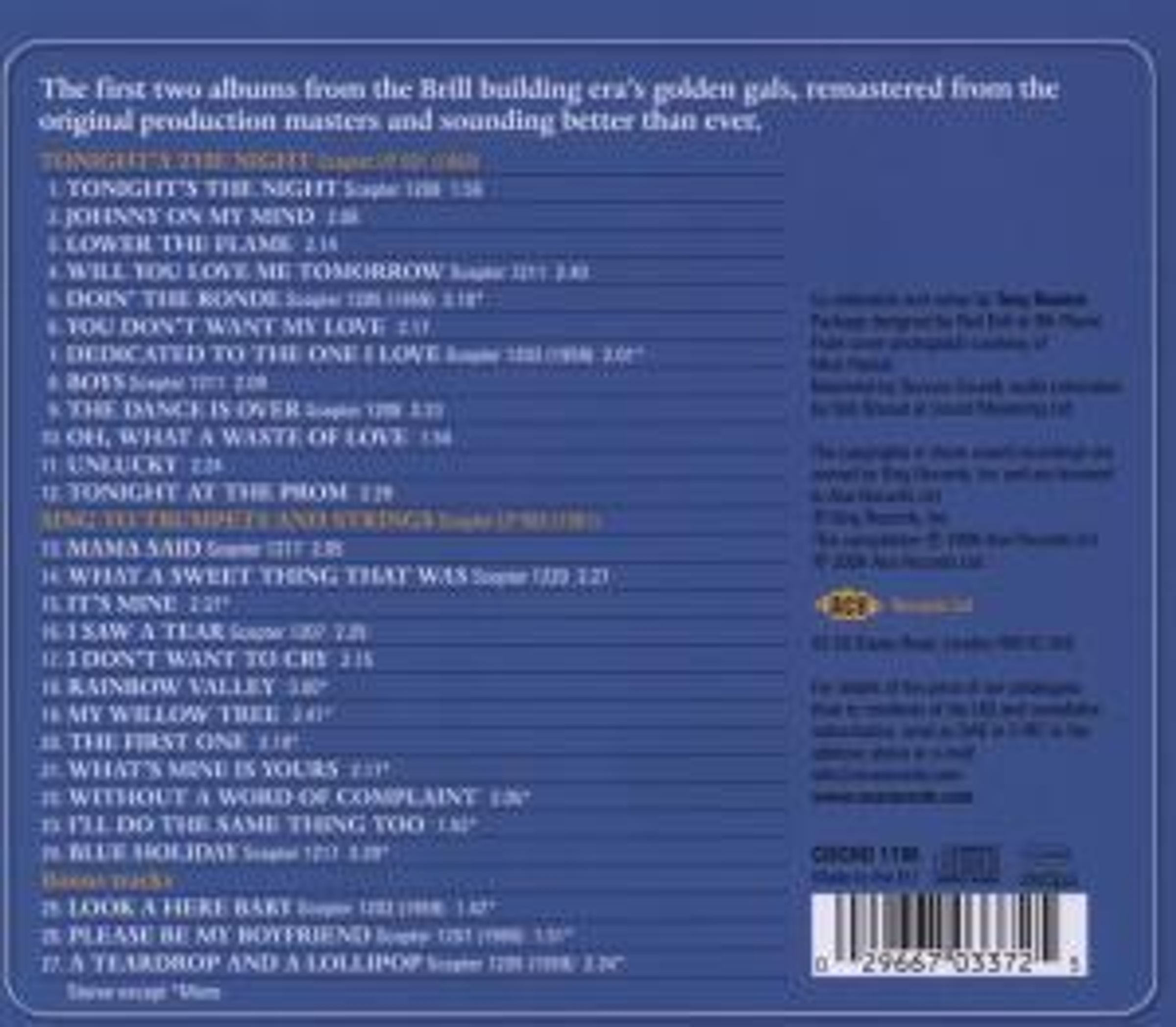 Familiar highlights include the risqué ‘Tonight’s The Night’, the Doris-led ‘Dedicated To The One I Love’ (which the girls learned from the Five Royales while on the road), ‘Boys’ (as famously covered by the Beatles) and ‘Mama Said’, plus of course ‘Will You Love Me Tomorrow’ and ‘What A Sweet Thing That Was’, two of Gerry Goffin and Carole King’s finest early compositions. Among the numerous gems only the most ardent of Shirelles fans will have heard before are ‘Johnny On My Mind’ (buffs might know the song by Lonnie Mack as ‘Dorothy On My Mind’), ‘I Don’t Want To Cry’ (ditto Chuck Jackson) and ‘Blue Holiday’ (Aretha Franklin). ‘It’s Mine’ (subsequently cut by Tammy Montgomery / Terrell) features a string section not heard on the original release, while ‘ Saw A Tear’ offers a rare chance to hear the voice of Florence Greenberg counting-in the girls. Roll on more volumes.