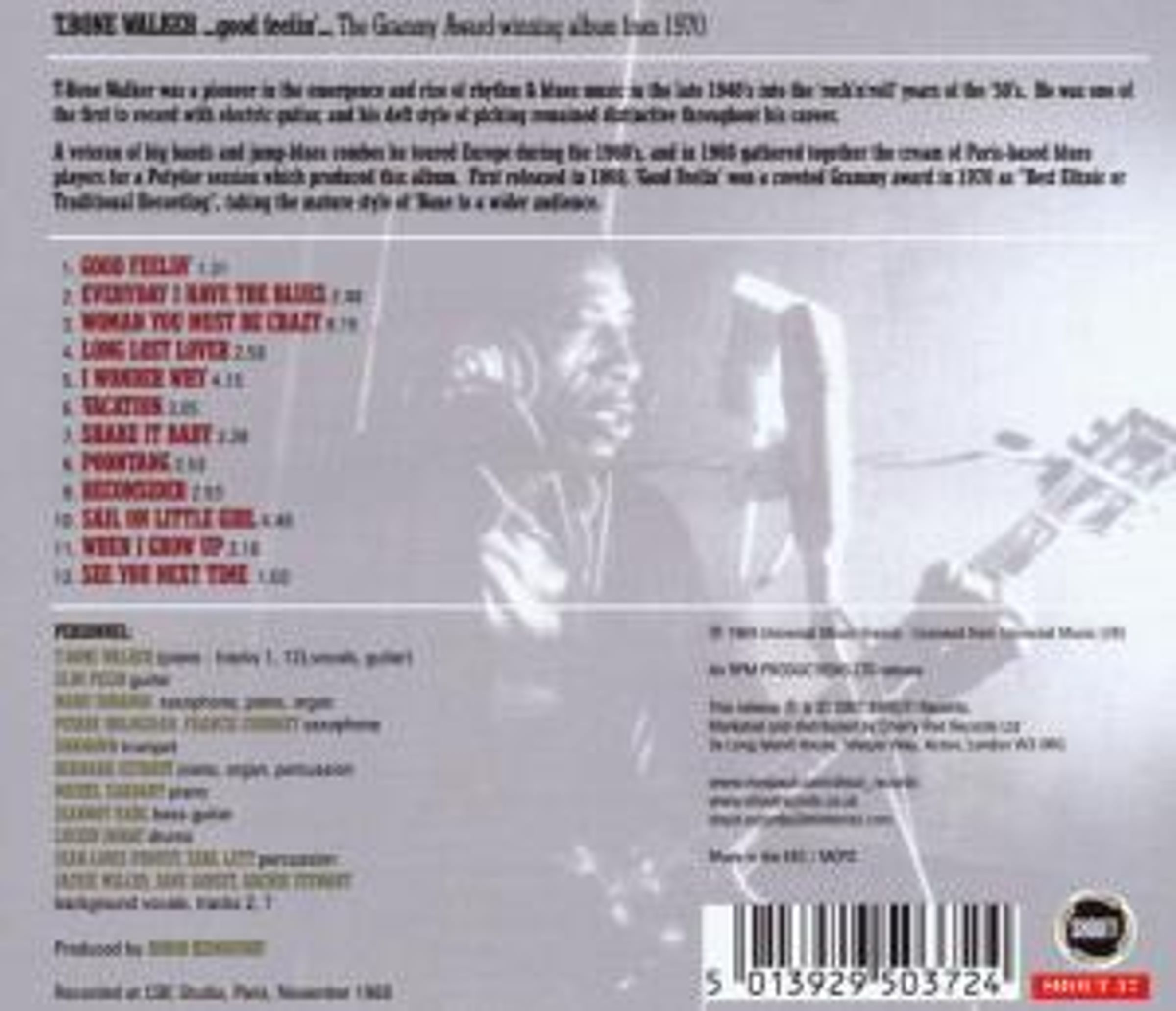 Following a successful tour of Europe with the American Folk Blues Festival in 1962, T-Bone returned to France in the late 1960's to record LPs for Black & Blue and Polydor, and from the latter label Good Feelin' won a coveted Grammy Award in 1970 as 'Best Ethnic or Traditional Recording'. Shout Records are proud to present another chance to hear the fine music in this landmark album, which features the sax of 'Soul Makossa' hit-maker Manu Dibango and the cream of local session men, the voice and guita