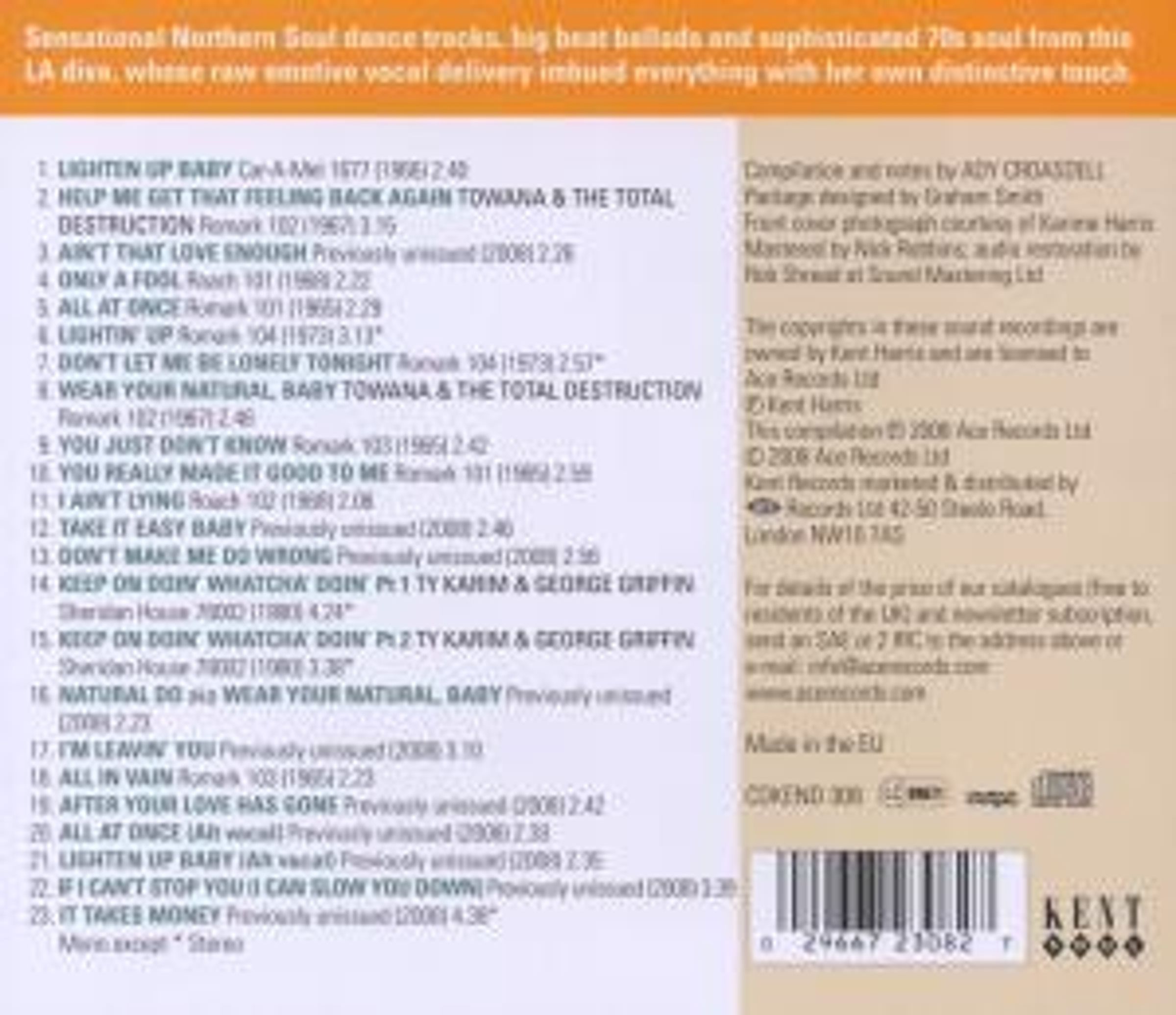 Sadly Ty died in 1983, but with her daughter Karime living only a couple of miles from Ace, we’ve pieced together this fascinating story. It includes how a Northern soul fanzine article about her mother inspired Karime to move to the UK and eventually led to her singing her parents’ wonderful music to very appreciative crowds on today’s Northern Soul circuit. Kent Harris has given us complete access to all his master tapes and photographs and we have even found new material and alternative takes on some of Ty’s songs, including a great blues version of ‘Lighten Up Baby’. The musical clarity from the masters is particularly good too; given the understandably poor sound quality of previous bootlegs of the music.