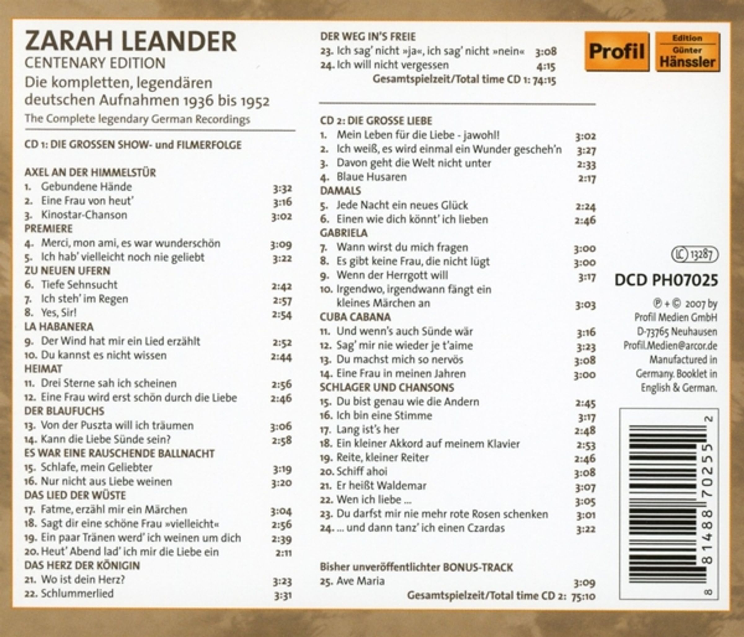 Zarah Leander: Centenary Edition: die kompletten legendären Aufnahmen auf 2 CDs