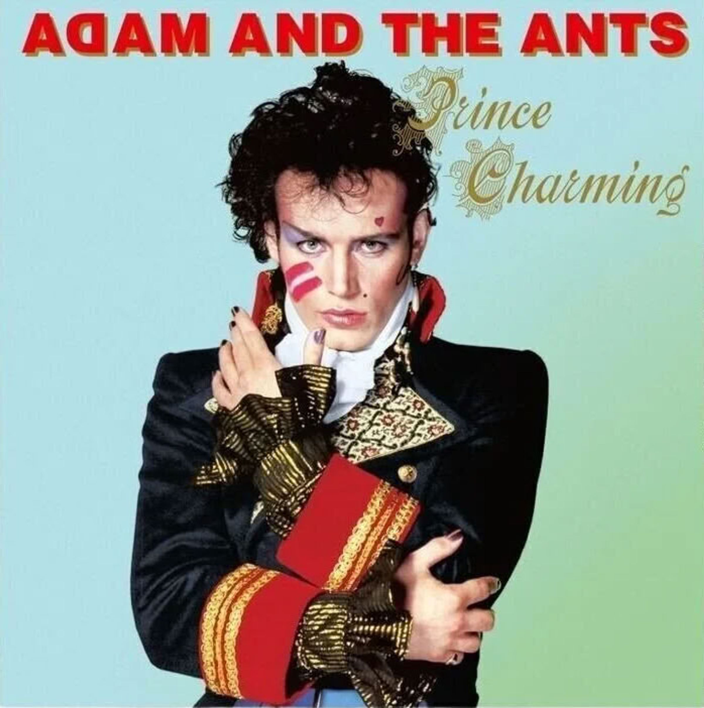 "ADAM AND THE ANTS" oben in Rot, "Prince Charming" in Gold. Person mit extravagantem Kostüm, auffälligem Make-up., LP