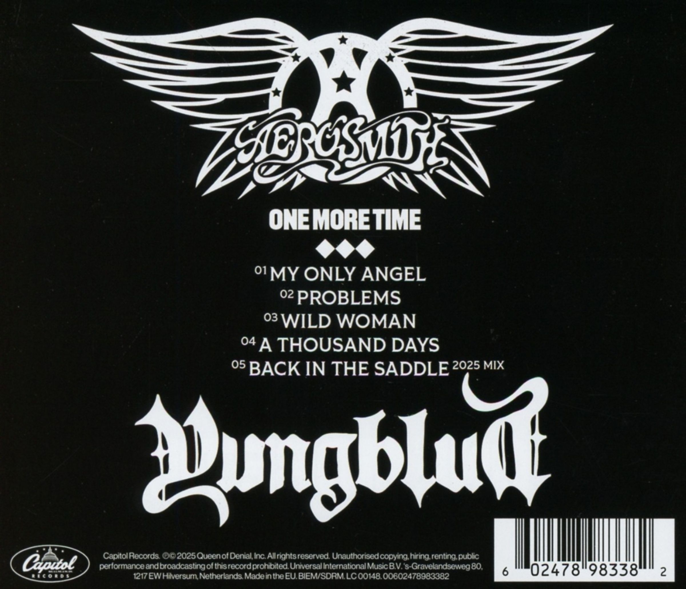 Nach einer legendären Tribute-Performance bei den VMAs vereinen sich die Rocklegenden Aerosmith mit dem aufstrebenden Star YUNGBLUD auf »One More Time«, das bei Capitol Records erscheint. Die 5-Track-EP enthält Vocals von Steven Tyler und YUNGBLUD, darunter 4 neue Songs, die von Steven Tyler, Joe Perry, YUNGBLUD und Matt Schwartz geschrieben wurden, sowie eine neu interpretierte Version des Aerosmith-Klassikers »Back In The Saddle«.