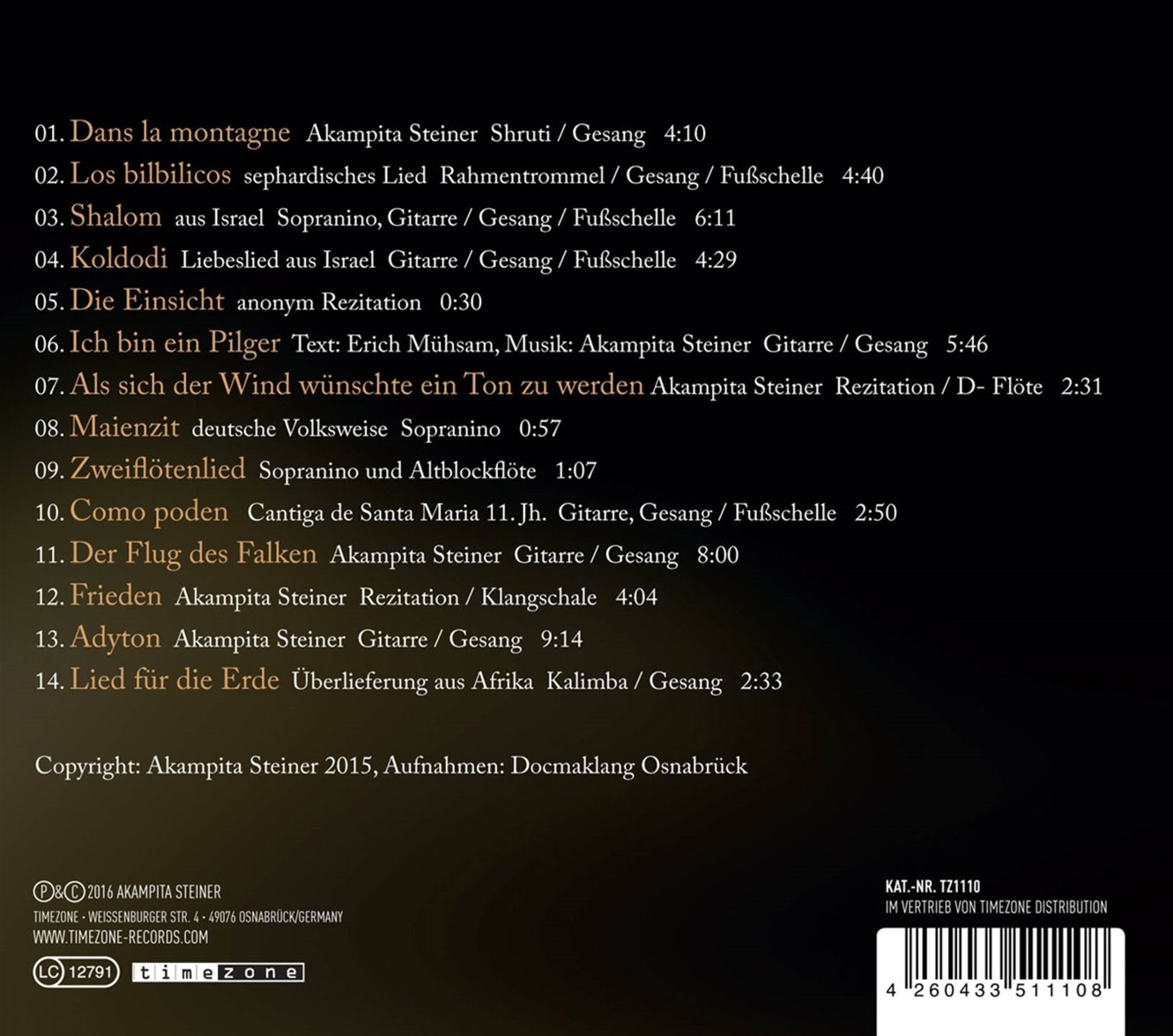 Die Grenzen zwischen Klassik, experimenteller Musik und U-Musik fließen ineinander und werden teilweise ganz aufgehoben. Akampita Steiner singt Lieder mit jüdischen Wurzeln, verwebt sie neu und vertont den Autoren Erich Mühsam. Die Grenzen schwinden zwischen Orient und Okzident, Komposition und Improvisation. Ihre samtene dunkle Stimme beeindruckt durch seine samtene Klarheit. In ihren eigenen Kompositionen besingt die Künstlerin eine Welt, in der Mitgefühl der Schlüssel zu einem freien, bunten und würdevollen Miteinander ist, in einer Gesellschaft, in der Frieden und Lebendigkeit einander Bedingung sind. Meditative Instrumentalkompositionen verdichten die Thematik, welche mit einem afrikanischen Lied die Ankunft in der Gegenwart darstellt.