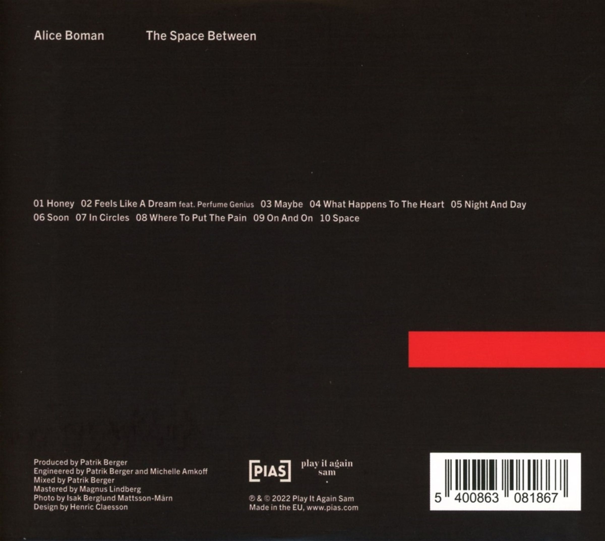 Ihr hauchzarter Gesang wird flankiert von flirrenden Gitarren (»Space«), Akkordeon (»Night and Day«), glitzernden Spieluhr-Effekten (»On and On«) und gedämpften Bläsern im Hintergrund (»Soon«). Für »Feels Like Home« wurden zusätzliche Vocals von Alice-Boman-Fan Perfume Genius beigesteuert. Die stillen Betrachtungen der Schwedin werden auf »The Space Between« von einfühlsamen Arrangements umhüllt, die in Zusammenarbeit mit dem Produzenten Patrik Berger (Robyn, Lana Del Rey, CharlieXCX) entstanden sind, der bereits das grandiose Debütalbum »Dream On« produzierte.