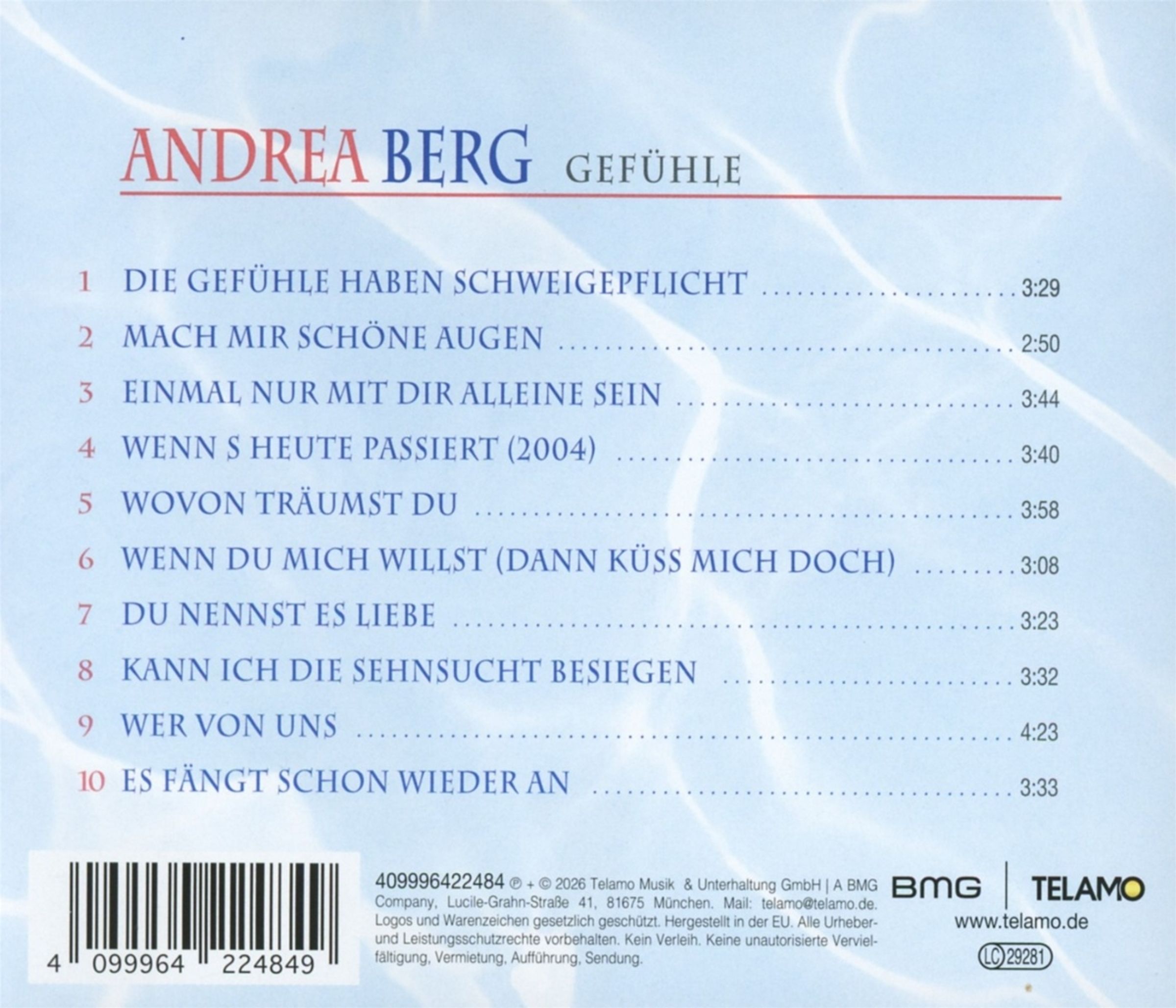 Die Wiederveröffentlichung eines der bekanntesten Alben von Andrea Berg steht für gefühlvolle Texte, eingängige Melodien und eine unverwechselbare Stimme. Das Album lädt zum Erinnern, Träumen und Mitsingen ein – für langjährige Fans ebenso wie für neue Hörerinnen und Hörer.