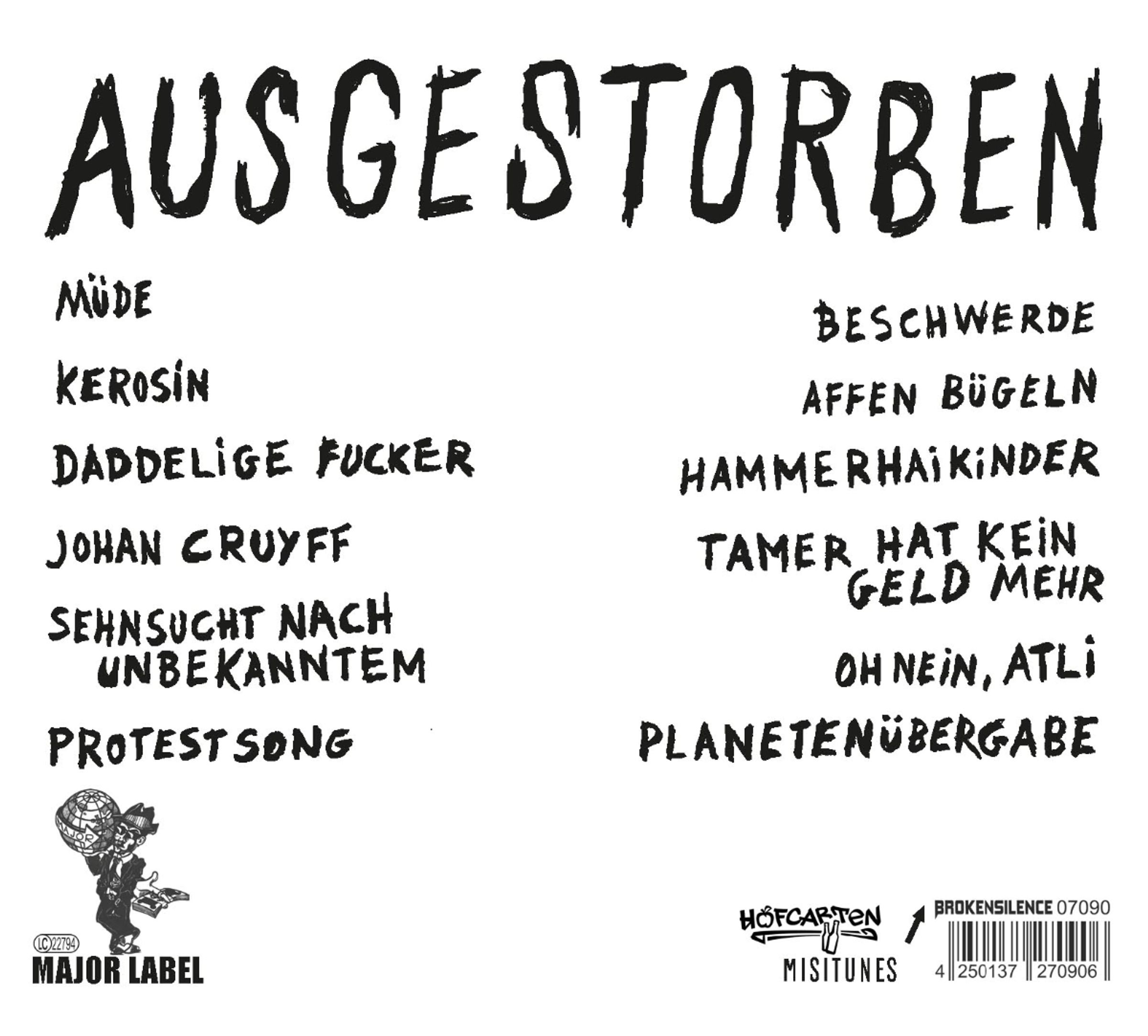 ”AUSGESTORBEN” in großer Schrift. Sensenmann sitzt trostlos in karger Landschaft, umgeben von Müll und Baumstümpfen., CD