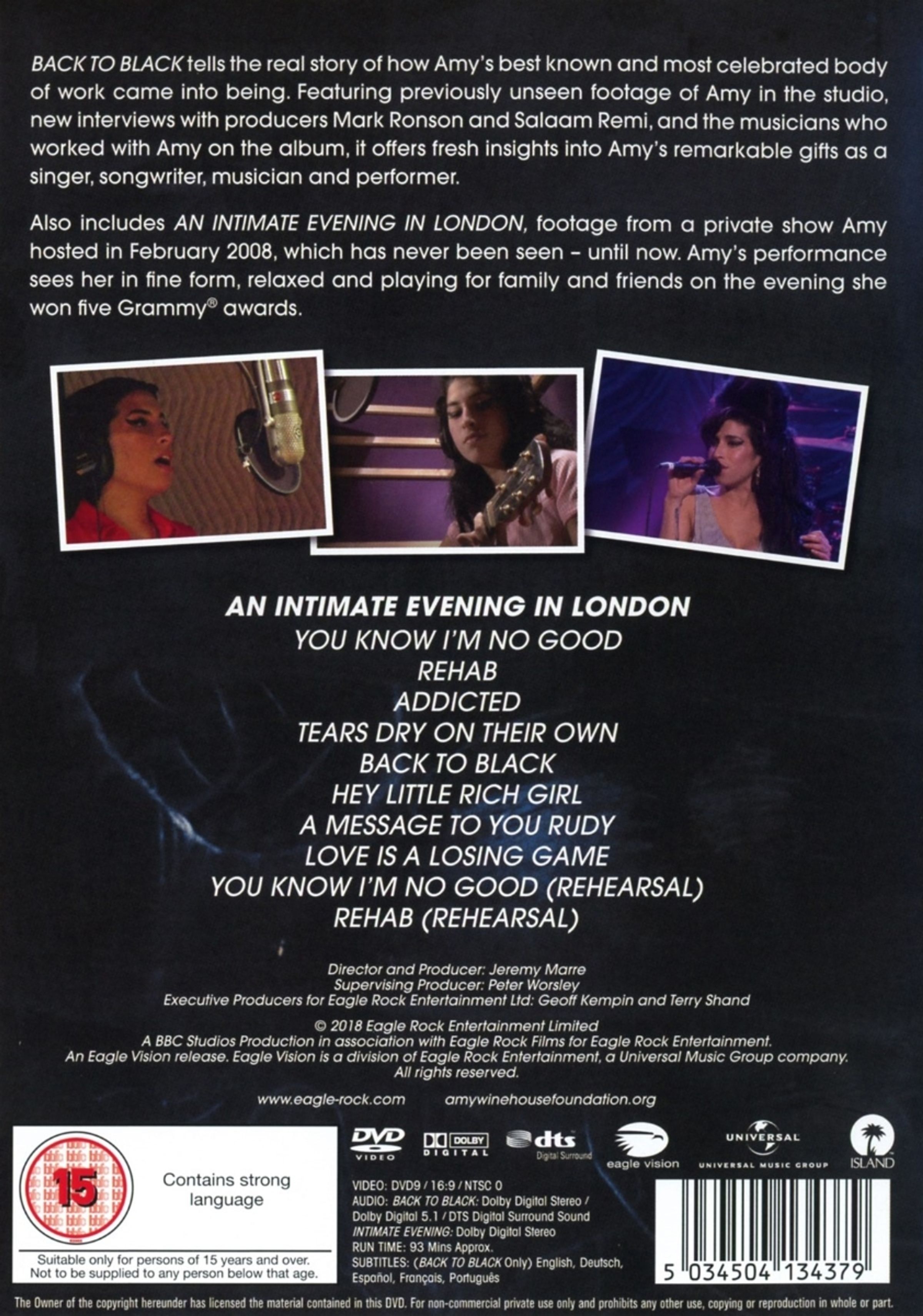 Black To Black tells the real story of how Amy's best known and most celebrated body of work came into being. Feat. previously unseen footage of Amy in the studio, new interviews with producers Mark Ronson and Salaam Remi, and the musicians who worked with Amy on the album, it offers fresh insights into Amy's remarkable gift as a singer, songwriter, musician and performer.