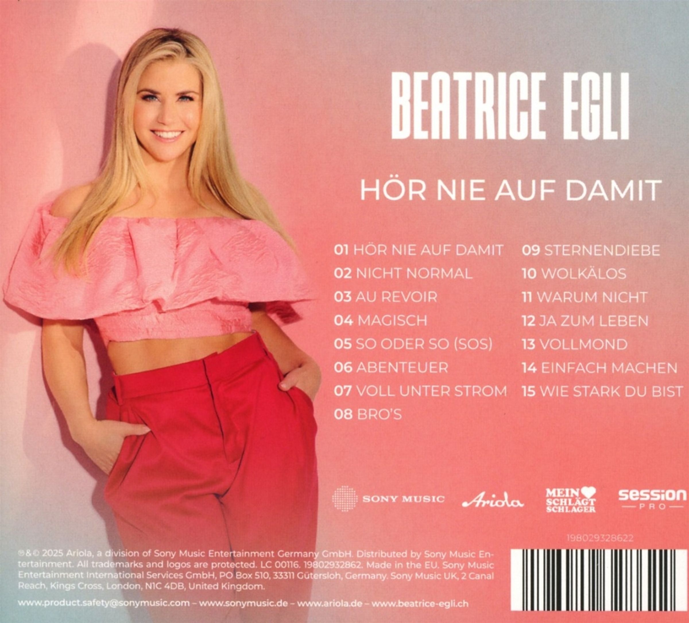Mit ihrem neuen Album »Hör nie auf damit« möchte Beatrice Egli ihren Fans eine kleine Auszeit vom stressigen Alltag schenken. Unbeschwerte Momente voller Leichtigkeit, um mal so richtig abzuschalten, die Batterien aufzuladen und sich auf die Kraft der Träume zu besinnen – sind sie es doch, die unseren Weg leiten und uns immer wieder aufs Neue inspirieren.