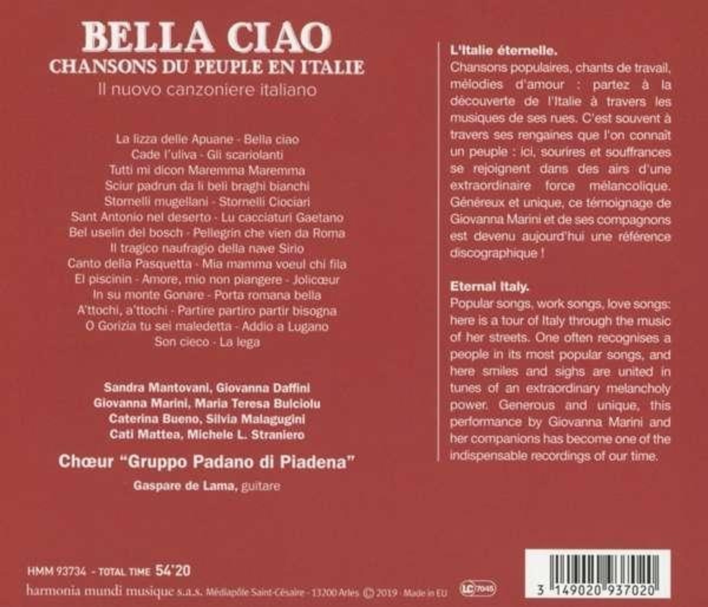 Giovanna Marini und ihrem Ensemble gelang eine umfassende und zeitlos gültige Sammlung italienischer Lieder, die seit über 40 Jahren nahtlos den Katalog von harmonia mundi ziert. Das titelgebende »Bella Ciao« erklingt zwei Mal: im Original als Arbeiterlied aus der Poebene und als Partisanenlied des Zweiten Weltkriegs.