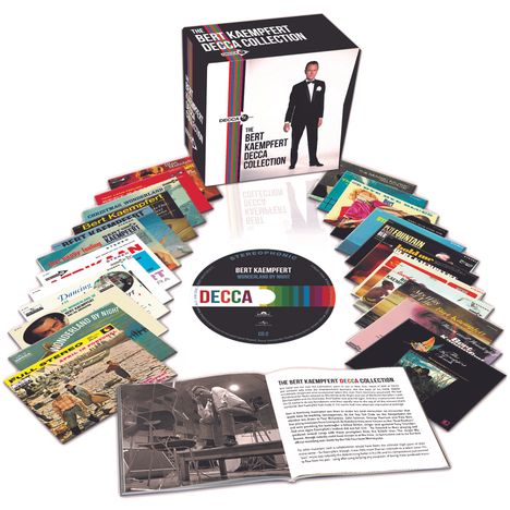 Über den gesamten Zeitraum seiner Karriere als Bandleader, vom Ende der 1950er Jahre bis zu seinem frühen Tod am 21. Juni 1980, war Bert Kaempfert zwei berühmten Schallplattenlabels treu: der deutschen Polydor und dem amerikanischen Decca-Label. Nachdem in der Vergangenheit der Polydor-Katalog Kaempferts in verschiedenen CD-Editionen wiederveröffentlicht wurde und alte und neue Fans begeisterte, wirft zu seinem 100. Geburtstag eine 24-CD-Box weltweit erstmals ein Schlaglicht auf seine in den USA erschienenen Decca-Alben. Obwohl sich das Repertoire von Kaempferts Decca- und Polydor-Alben überschneidet, ist diese Sammlung der amerikanischen Alben von 1958 bis 1970 eine Schatztruhe der wichtigsten Aufnahmen Kaempferts durch eine ganz neue Brille betrachtet.