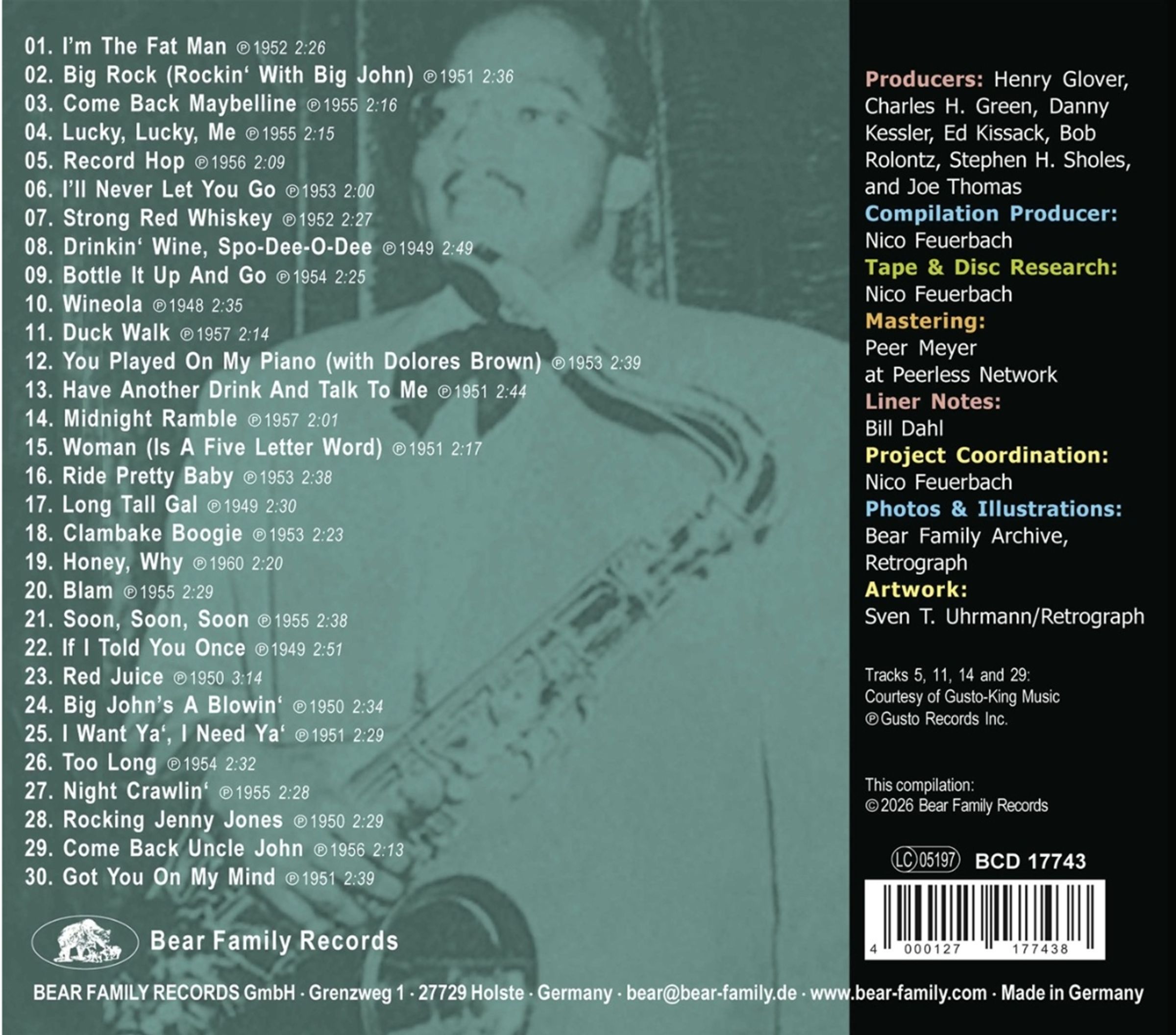 Schon in seiner Jugend in Hot Springs, Arkansas, bekannt als »240 Pounds of Solid Jive«, führte Greers Weg konsequent nach oben – über die musikalische Kaderschmiede des präzise geführten Lucky Millinder Orchestra hin zu einer Serie bahnbrechender Aufnahmen für RCA Victor. Ab 1949 etablierte sich Big John Greer & The Rhythm Rockers als feste Größe im R&B-Katalog des Labels. Klassiker wie »Rocking Jenny Jones«, »Red Juice«, »Big Rock«, »Clambake Boogie« oder das autobiografische »I'm The Fat Man« zeigen Greer auf dem Höhepunkt seiner Ausdruckskraft.