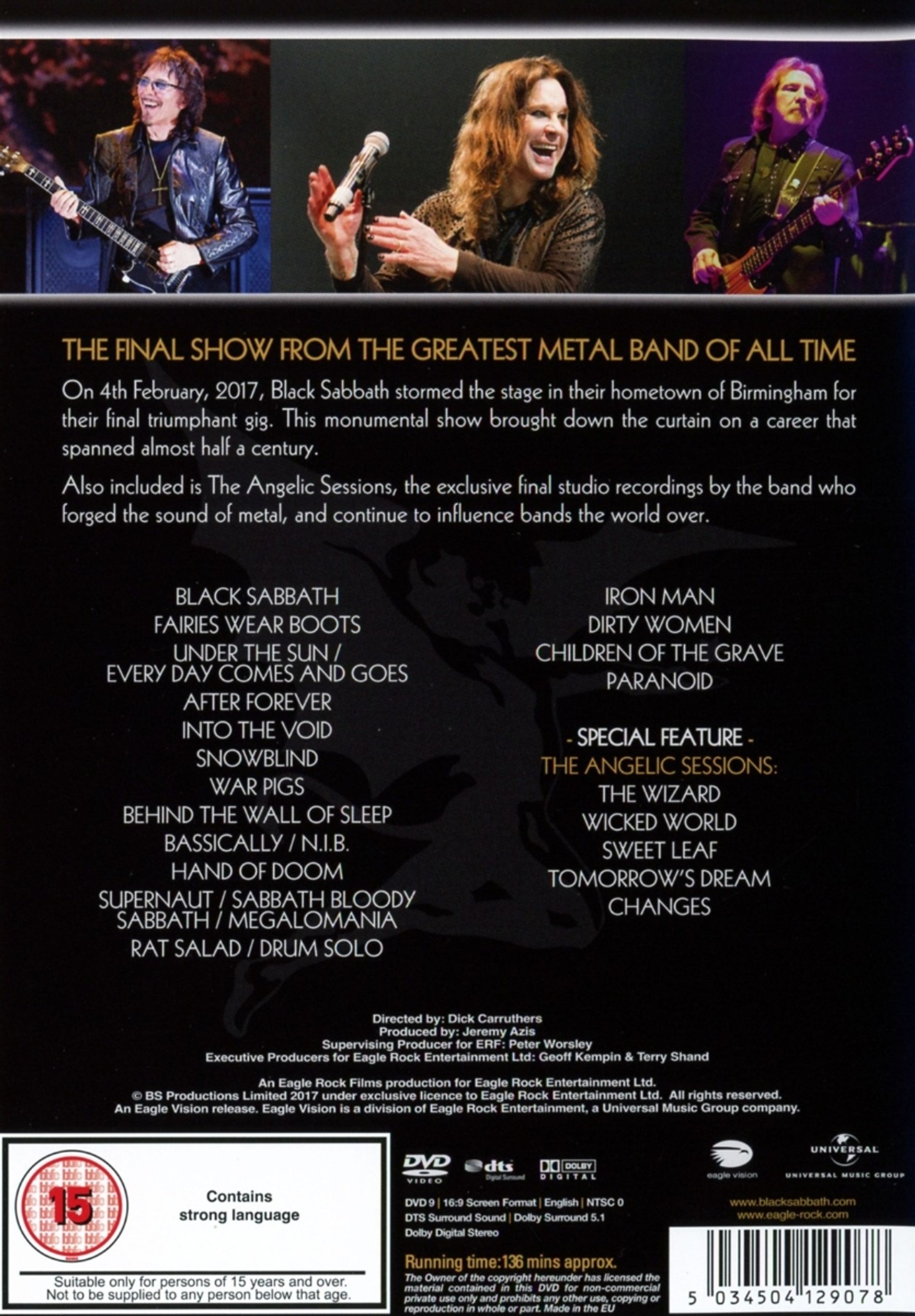 Liveversionen von Klassikern wie »Iron Man«, »Paranoid«, »War Pigs« und vielen mehr warten auf »The End«. Der Film enthält zudem ein paar spannende Studioaufnahmen ausgewählter Lieder, die Black Sabbath nicht auf der Tour spielen: »The Angelic Sessions« wurden nach ihrer letzten Show in Birmingham aufgenommen. Außerdem wirft der Film einen spannenden Blick hinter die Kulissen. Regie führte kein Geringerer als Dick Carruthers.