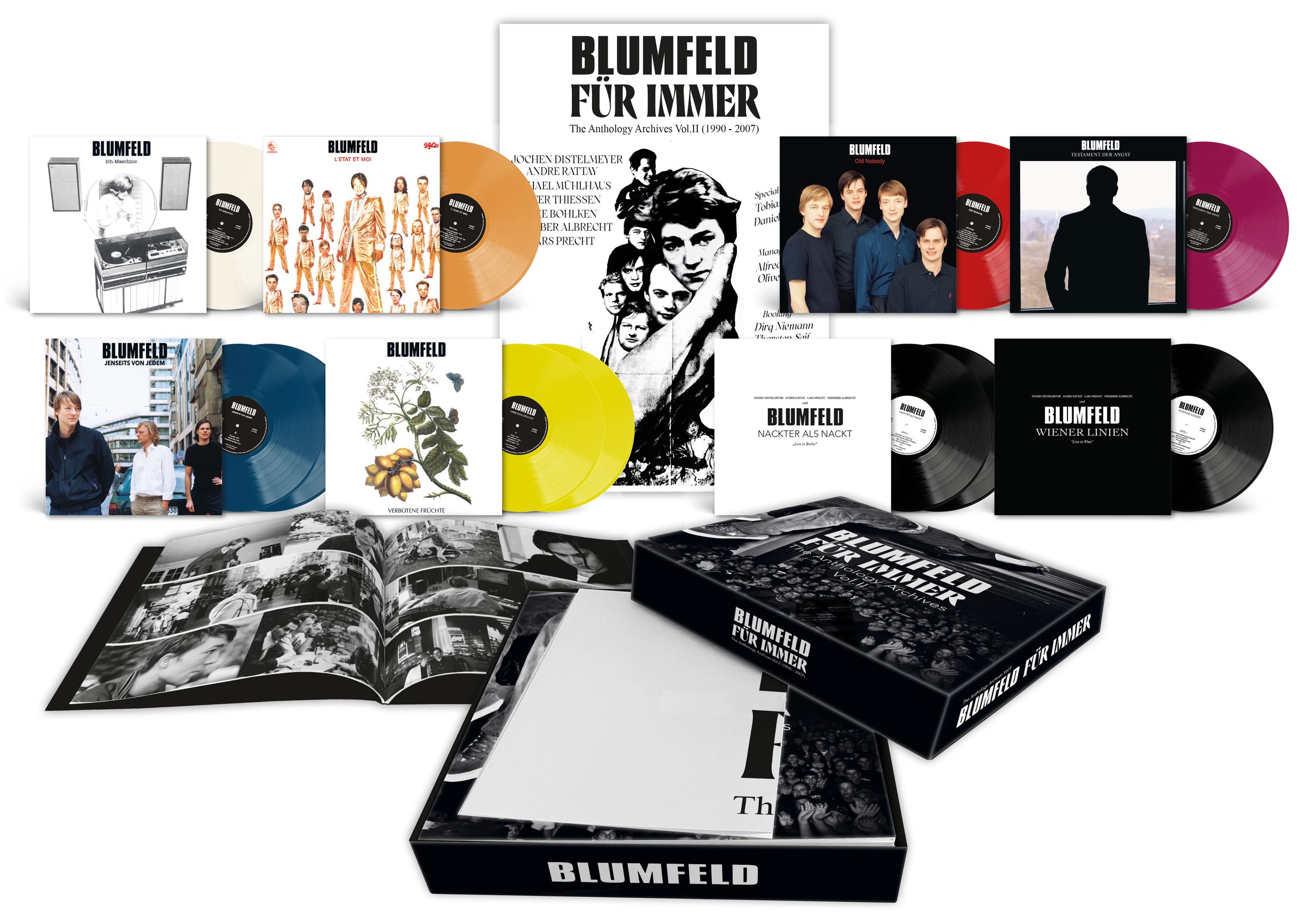 Mit »Für Immer - The Anthology Archives Vol. II« veröffentlicht Sony Music eine hochwertige, streng limitierte Vinyl-Box, die den gesamten sechs Alben umfassenden Blumfeld-Katalog in neu gestalteter Form vereint. Die Edition erscheint in einer Auflage von 1.990 Exemplaren, angelehnt an das Gründungsjahr der Band, und richtet sich sowohl an langjährige Fans als auch an anspruchsvolle Vinyl-Sammler und Sammlerinnen. Jedes Studioalbum wurde visuell neu interpretiert und auf farbigem Vinyl produziert, dessen Farbgebung jeweils auf das originale Artwork abgestimmt ist. Ergänzt wird die Box durch ein exklusives Fotobuch mit zahlreichen bislang unveröffentlichten Bildern sowie ein speziell für diese Edition gestaltetes A2-Poster.