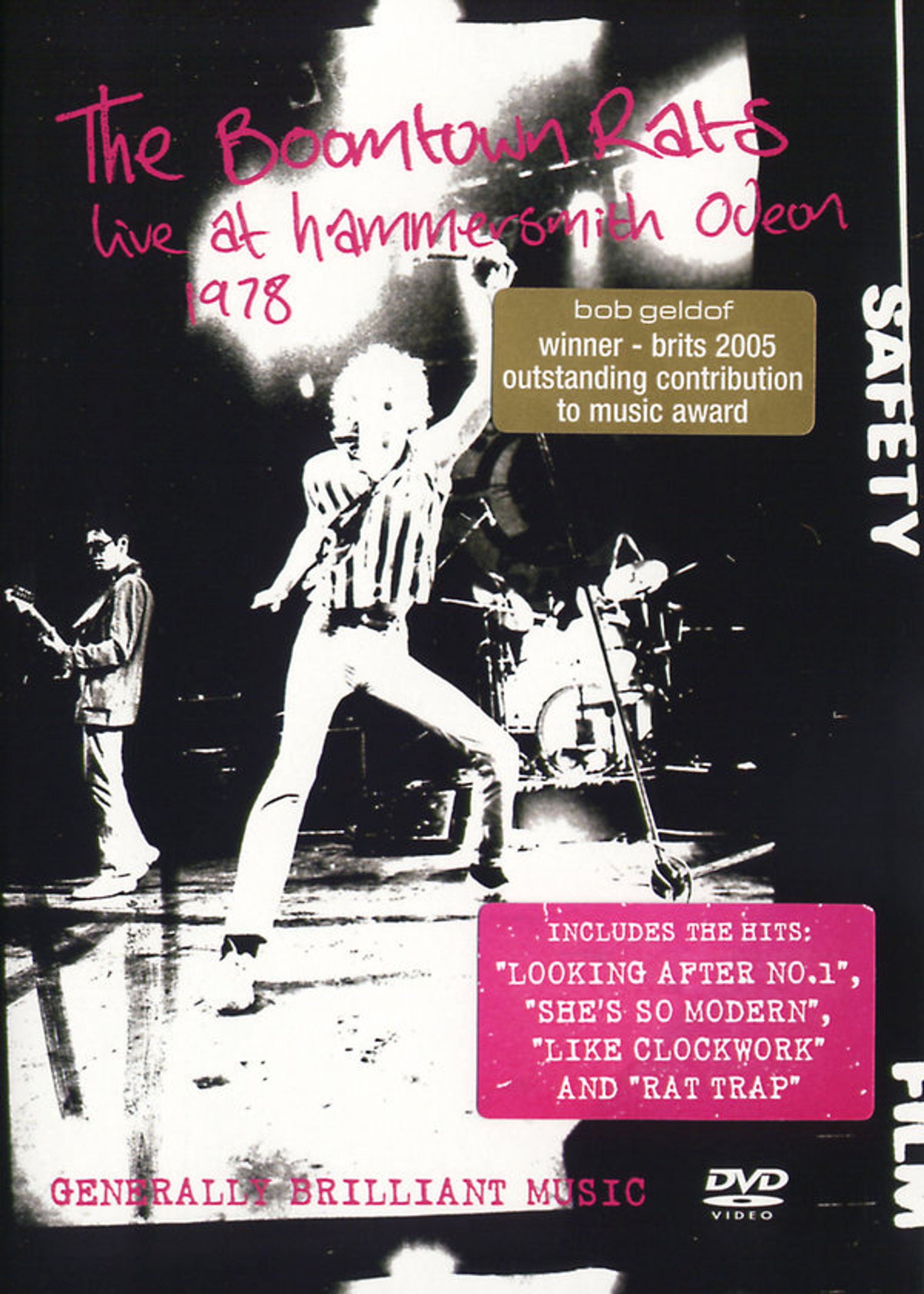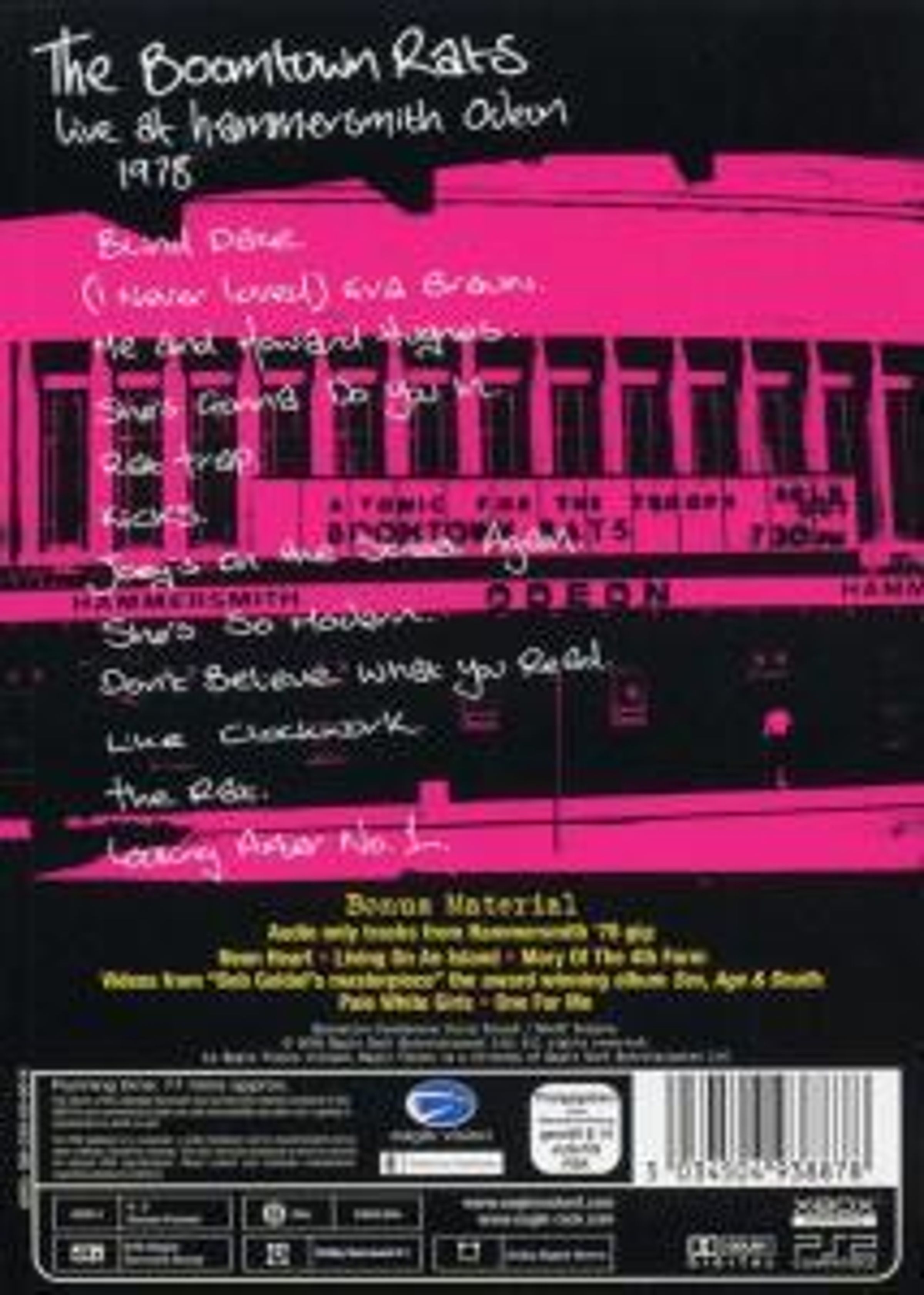 The Boomtown Rats were founded in Ireland in 1975. This show was filmed at London’s Hammersmith Odeon in the summer of 1978. It includes the hit singles Looking After No. 1, She’s So Modern, Like Clockwork and Rat Trap, which later that year would become the first New Wave No. 1 hit, along with other Rats favourites such as I Never Loved Eva Braun and Joey’s On The Streets Again. Also included is the audience participation number Do The Rat, which was a popular feature of early Rats gigs. The film and sound have been restored under the supervision of Bob Geldof and Pete Briquette to give the best possible DVD whilst retaining the rough and ready feel and the raw excitement of early Rats gigs. As a bonus feature there are three audio only tracks from the same show which have been remixed into 5.1 Surround Sound but for which sadly there is no visual footage available: Neon Heart, Living On An Island and the hit single Mary Of The Fourth Form.