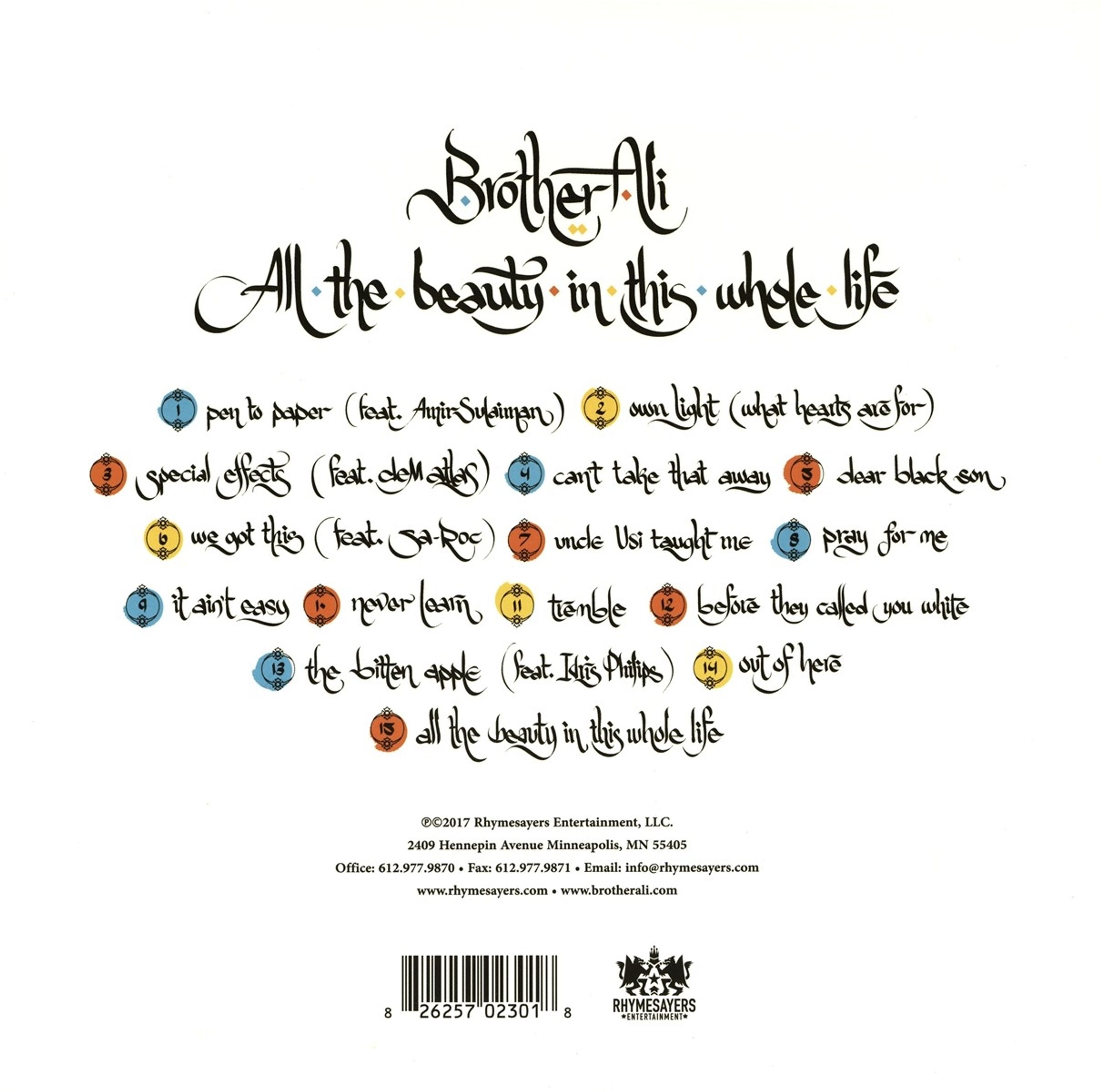 Brother Ali ist ein hoch angesehener HipHop-Musiker, politischer Aktivist und praktizierender Muslim aus Minneapolis, USA. Oder wie Spiegel Online einmal schrieb »ein weißer, fast blinder Musiker aus Wisconsin […] der Rap-Musik den Soul zurückgibt.« Auf seiner Vita kann er nicht nur mehrere Alben und EPs verbuchen, sondern auch Chuck D von Public Enemy als einen seiner Mentoren bezeichnen. Neben Auftritten in Late-Night-Shows von Conan O'Brien und Jimmy Fallon durfte er mit seinem starken Glauben an das Freiheitsversprechen Amerikas sogar schon die Hauptrede beim Friedensnobelpreis halten. Nun erscheint sein neues und von DJ Ant (Atmosphere) produziertes Album »All The Beauty In This Whole Life«.