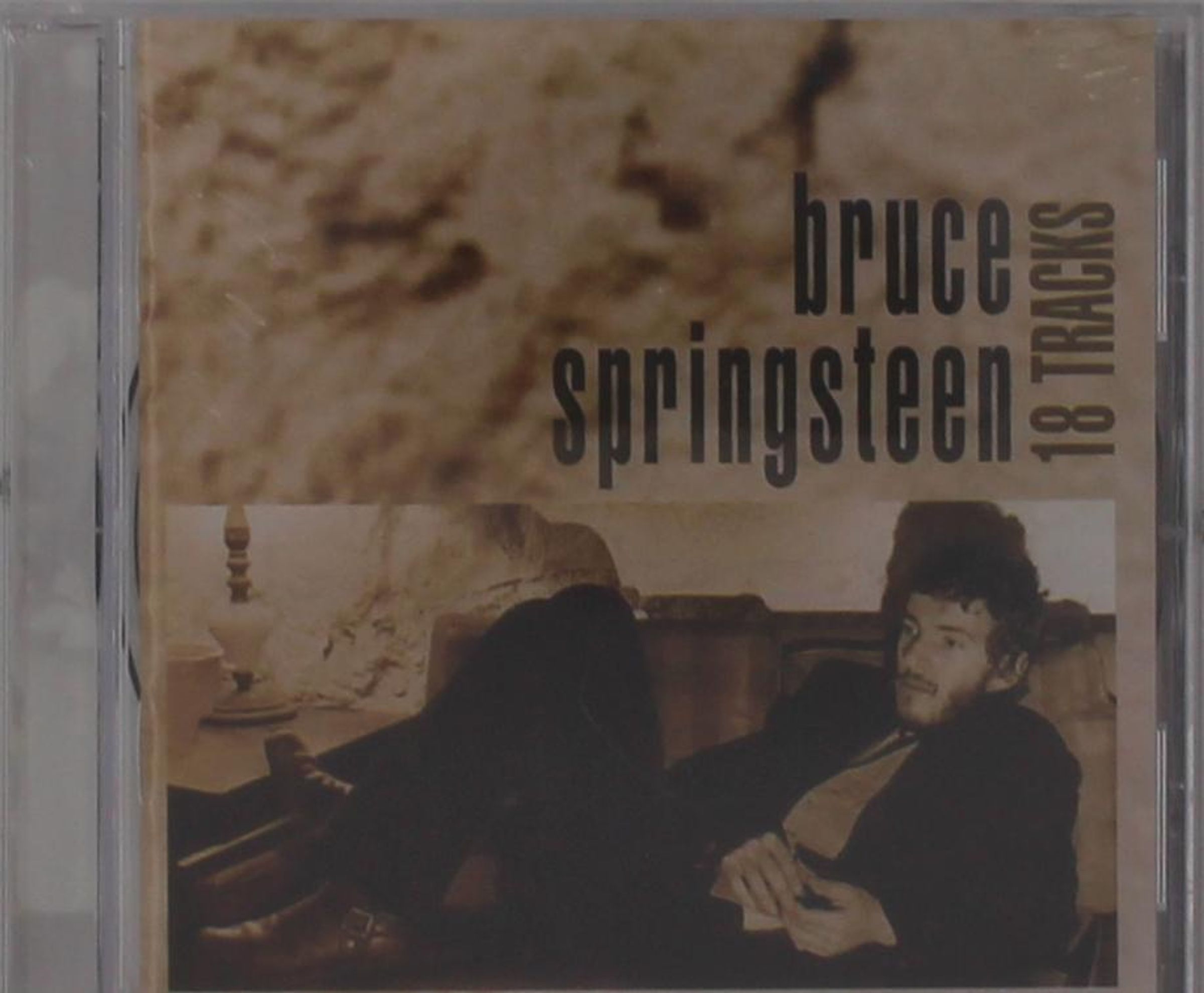 Text: "Bruce Springsteen 18 Tracks". Sepiafarbenes Cover mit einem Mann in entspannter Haltung auf einem Sofa., CD