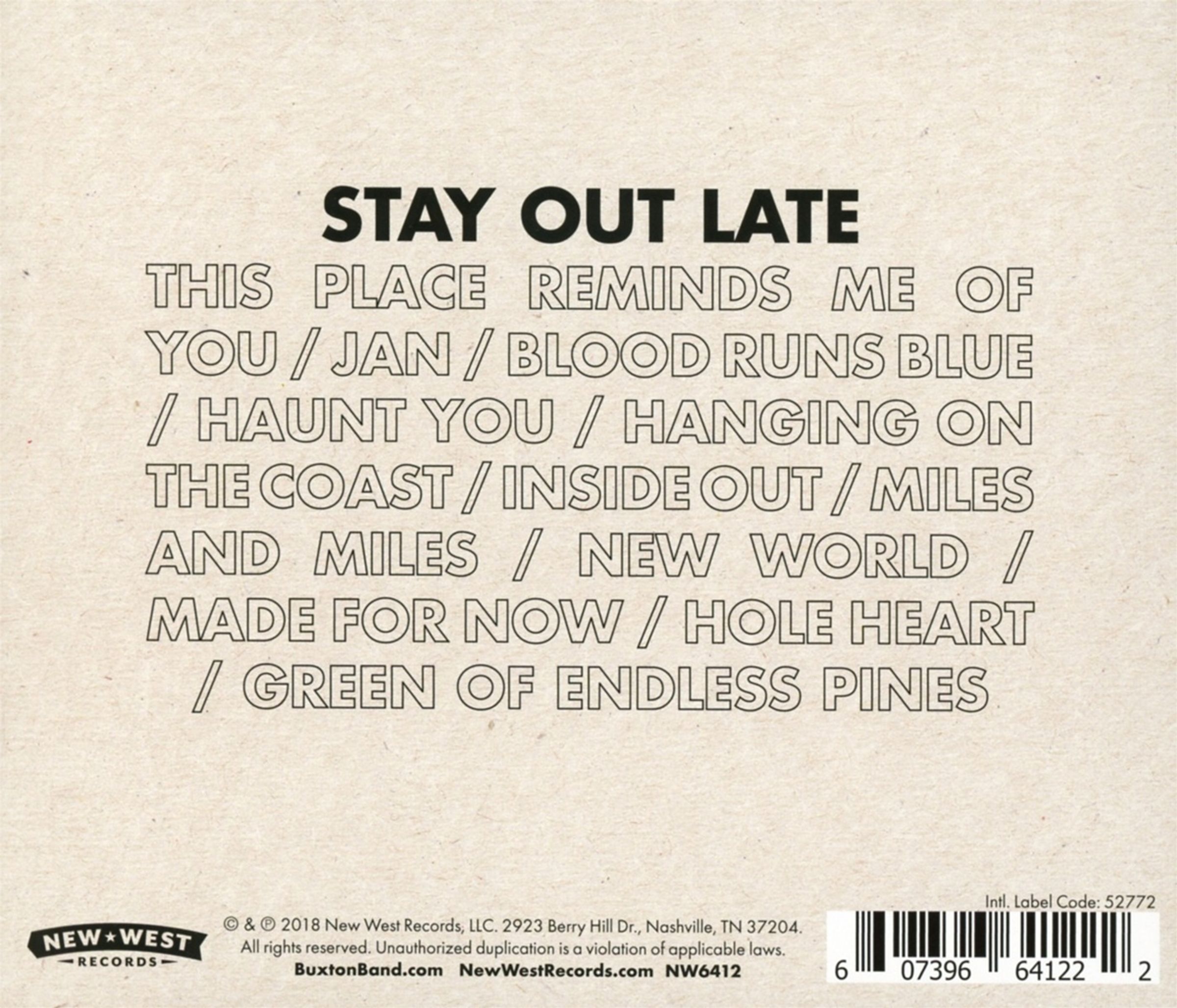 »Stay Out Late« markiert so etwas wie ein Doppeljubiläum für die Band aus La Porte, Texas. Seit 15 Jahren gibt es Buxton schon. Mit »Stay Out Late« veröffentlichen sie ihr fünftes Album. Es ist das Endresultat eines Wiederfindungsprozesses. Zu erkennen wer man ist. Und wer eben nicht. Als Band. Die eigenen Stärken aber auch Einschränkungen.