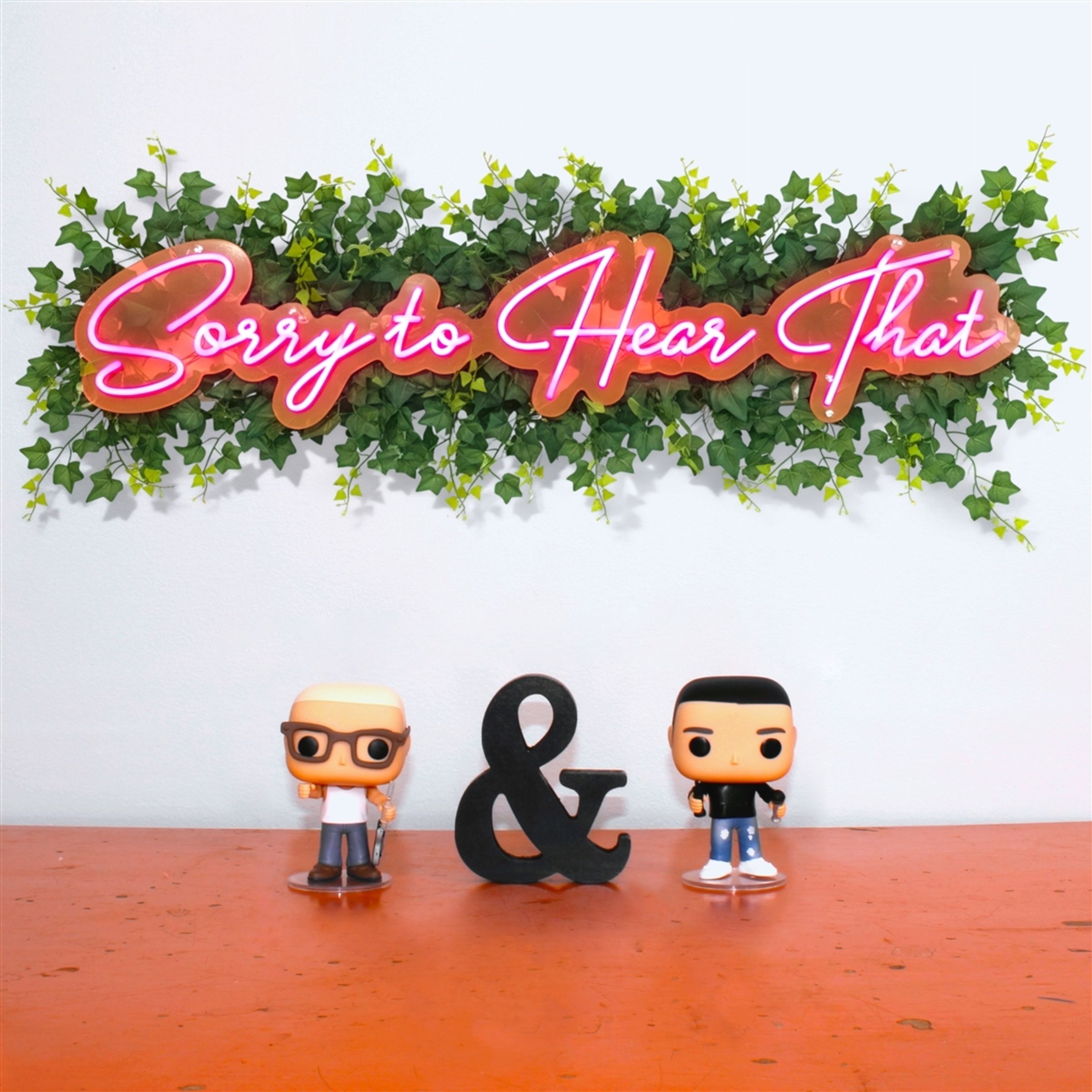 „Sorry to Hear That“ in pinkem Neonschriftzug auf Blättern. Zwei Figuren und ein „&“-Zeichen auf orangem Tisch., 2 LPs